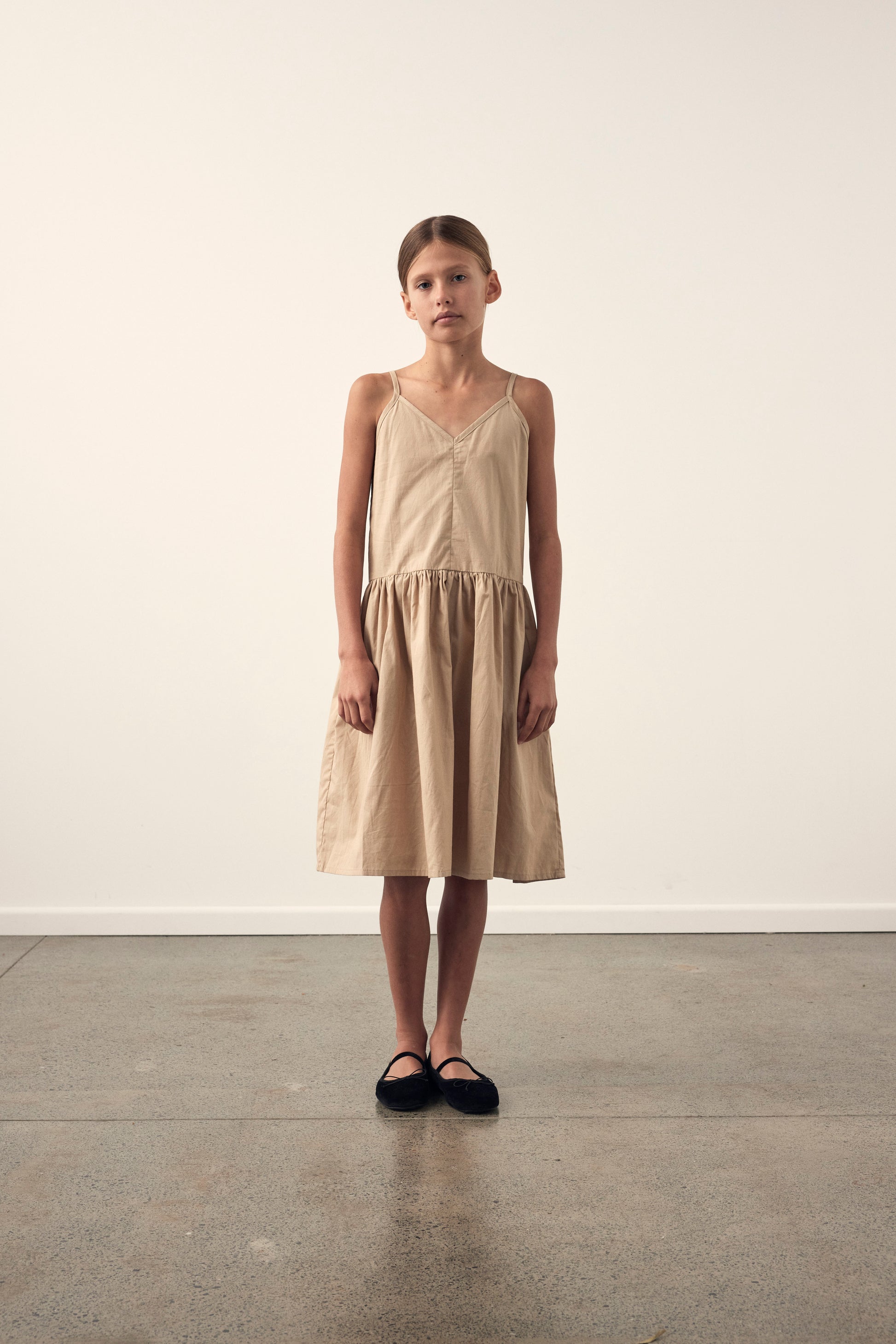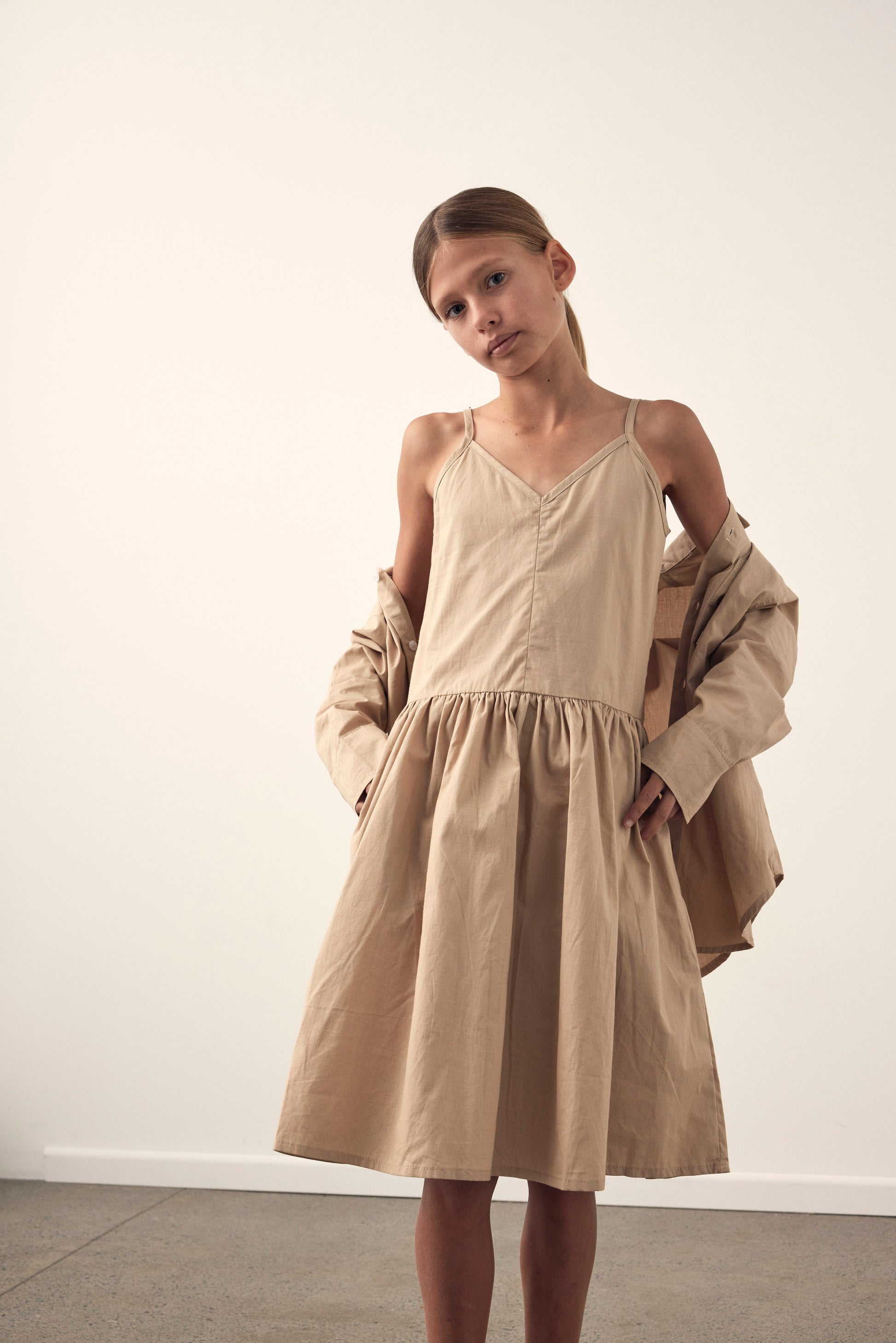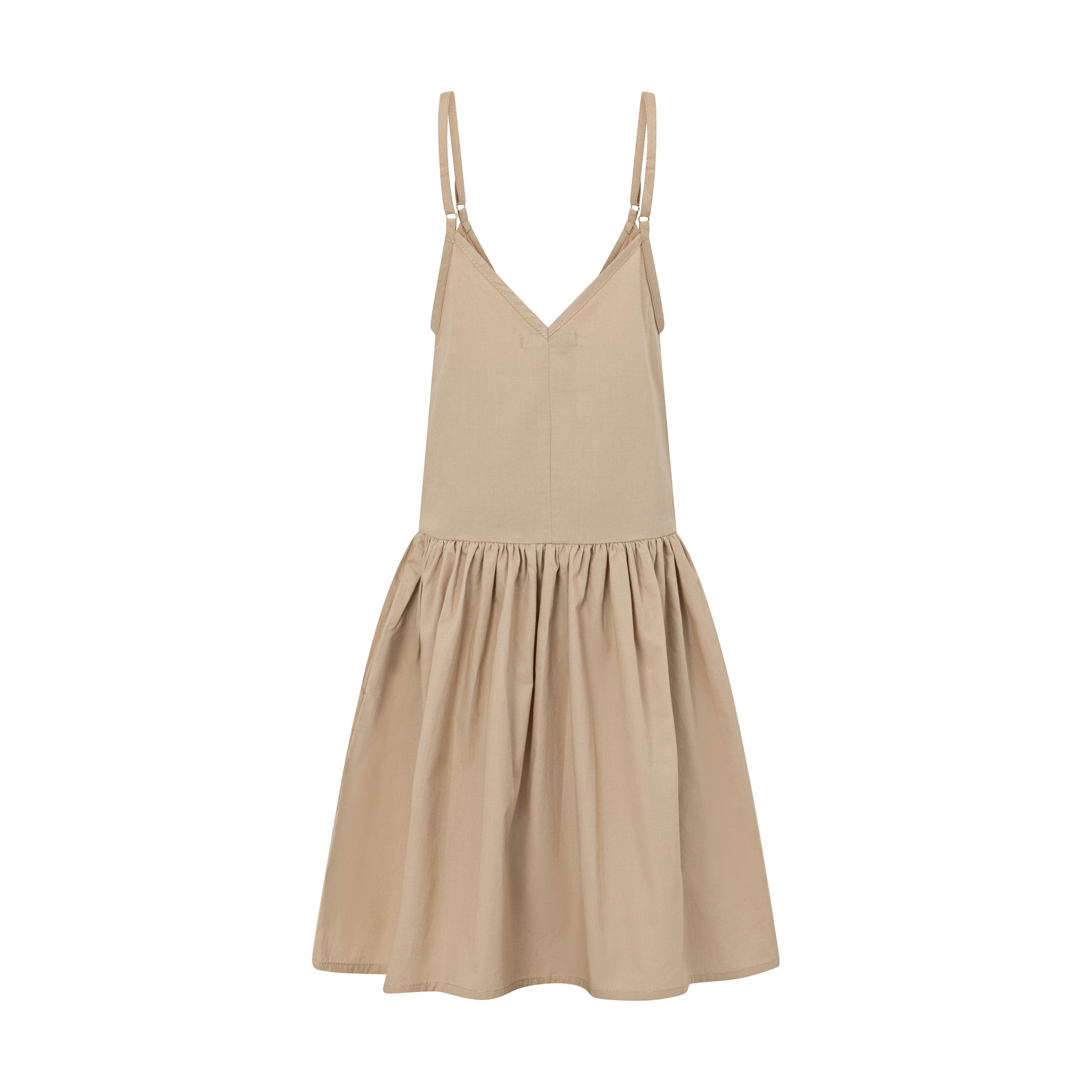 The Amella dress is a dropped waist dress made from light weight 100% cotton poplin. It features a v neckline both front and back with thin adjustable straps. Low waist line, side pockets and full skirt.