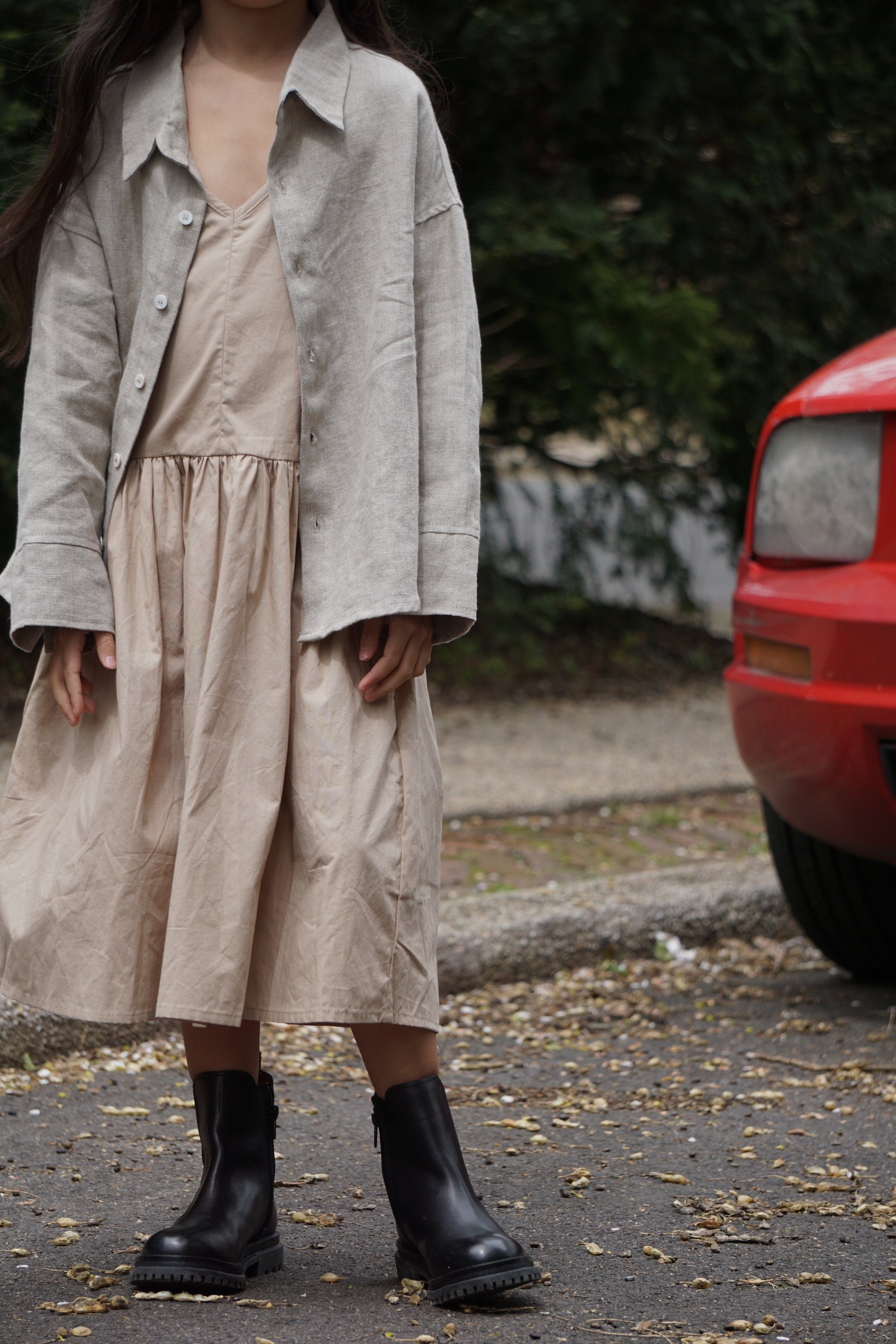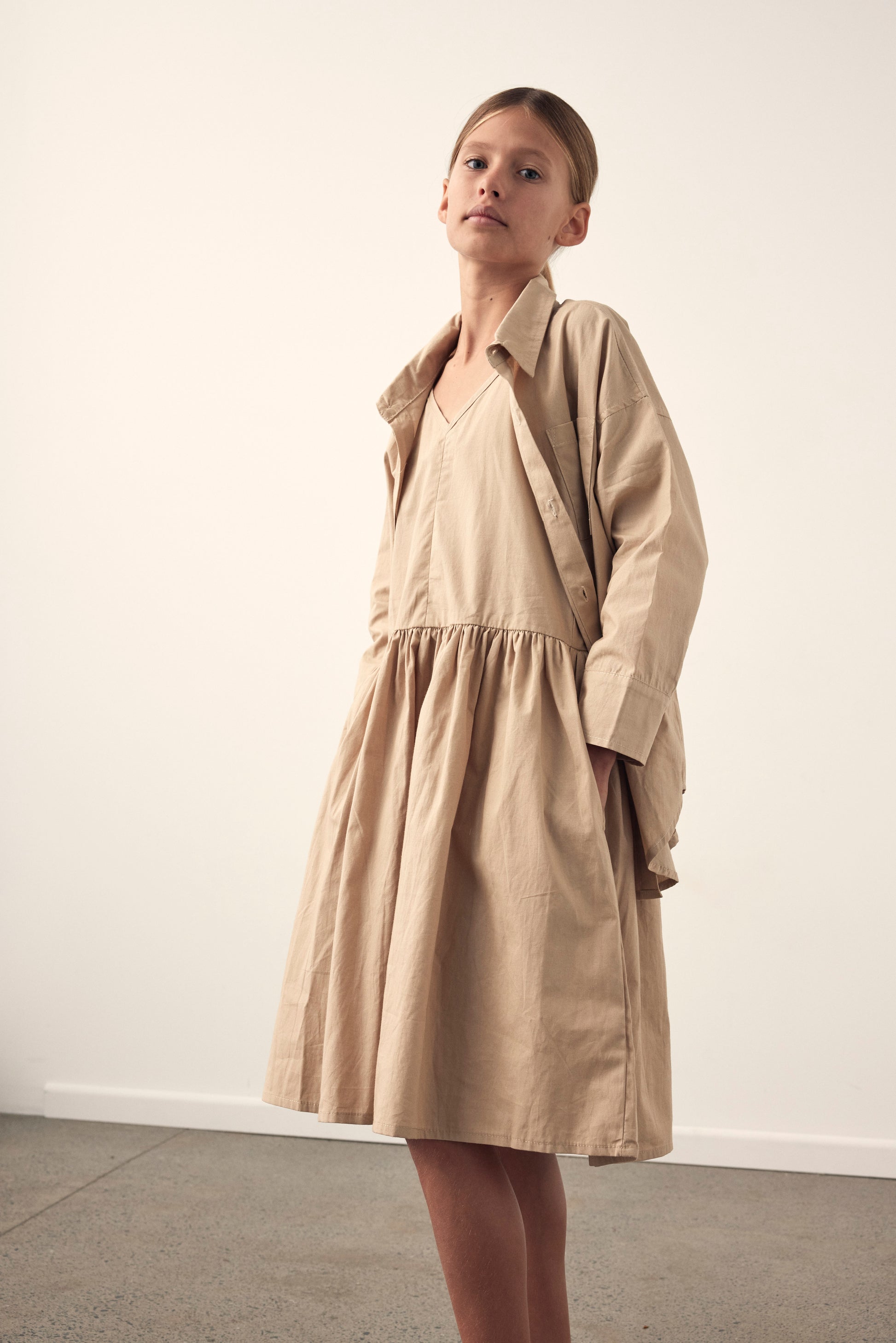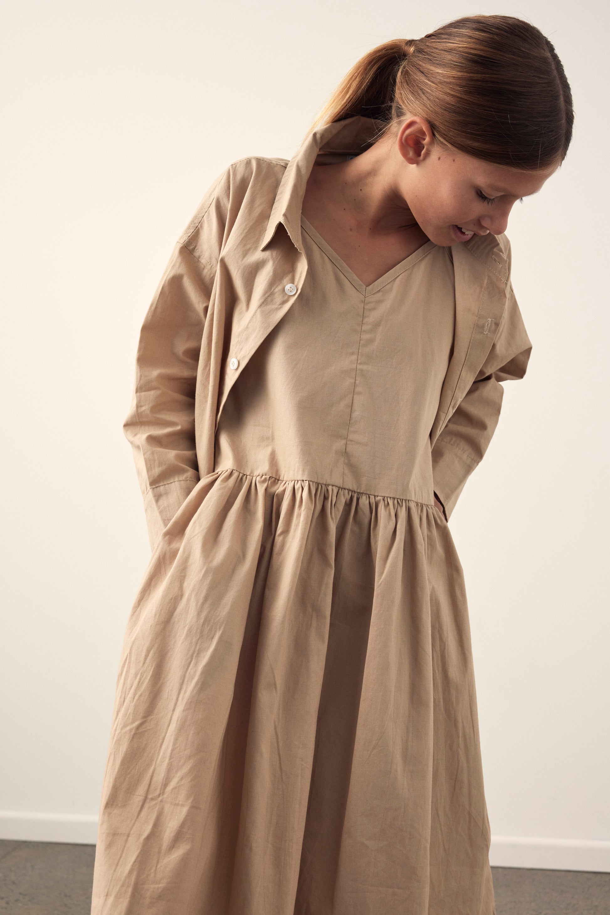 The Amella dress is a dropped waist dress made from light weight 100% cotton poplin. It features a v neckline both front and back with thin adjustable straps. Low waist line, side pockets and full skirt.