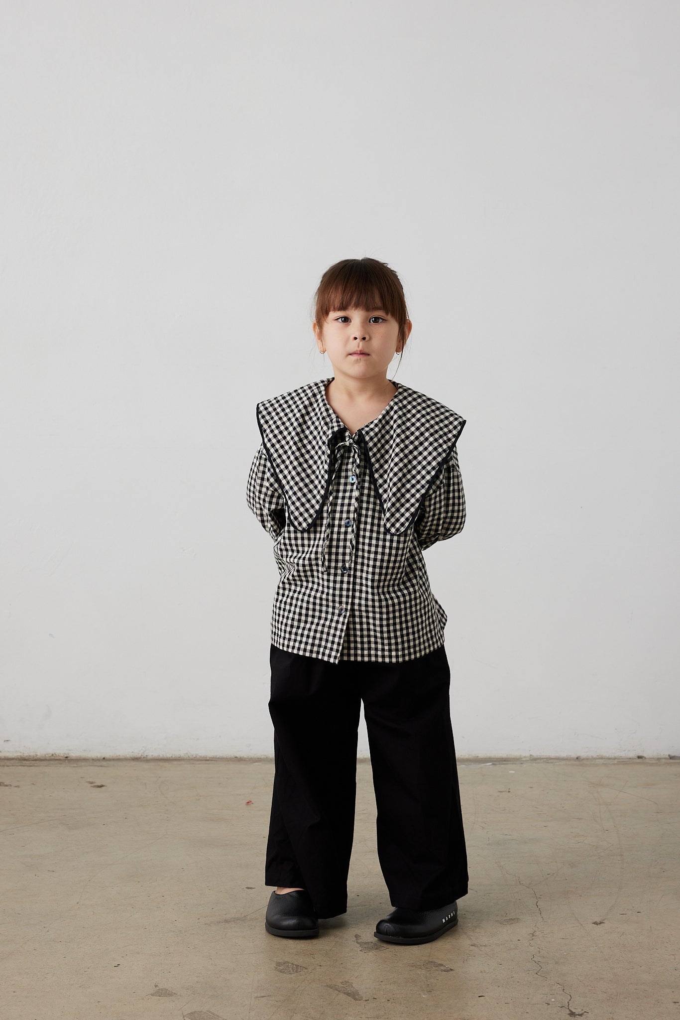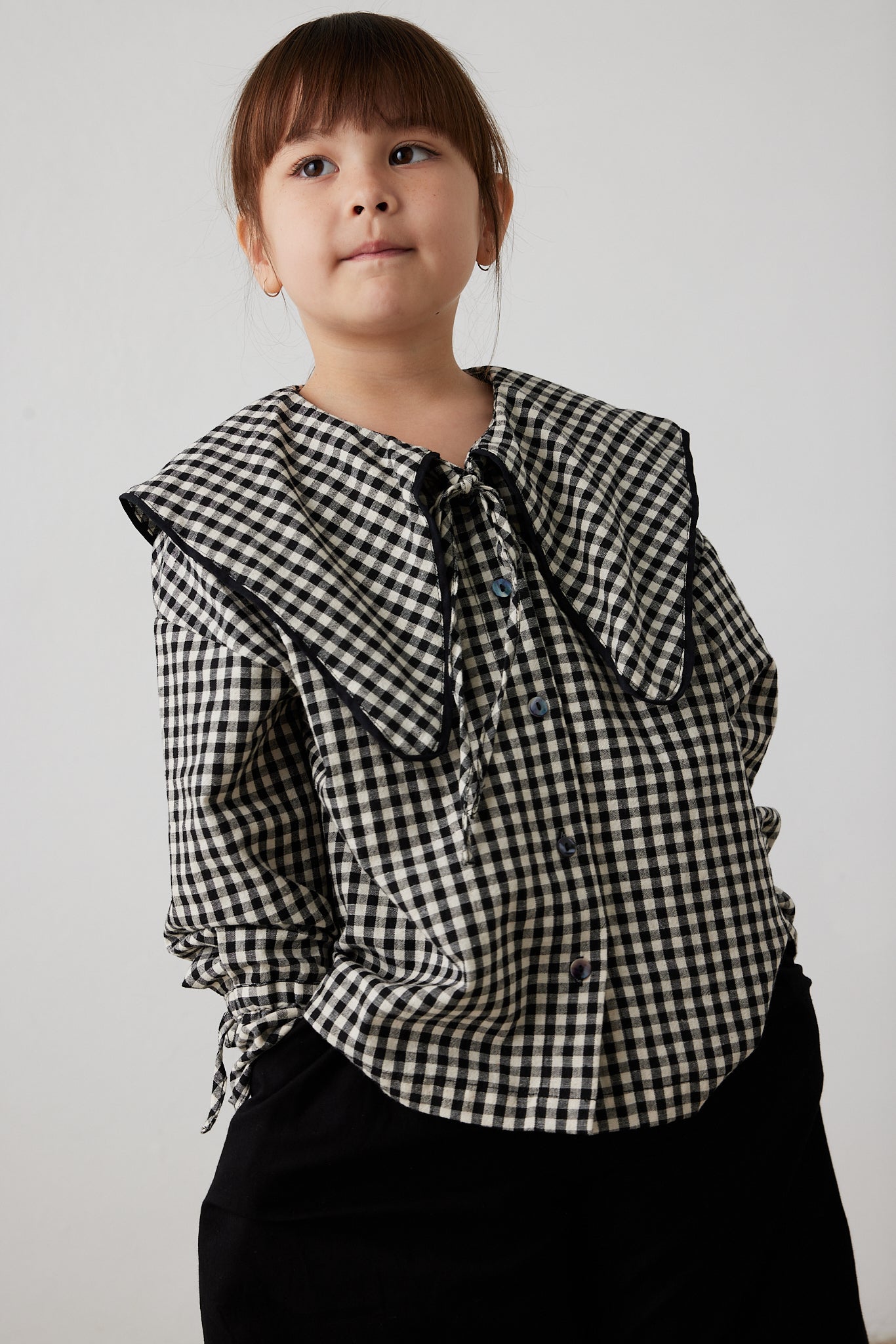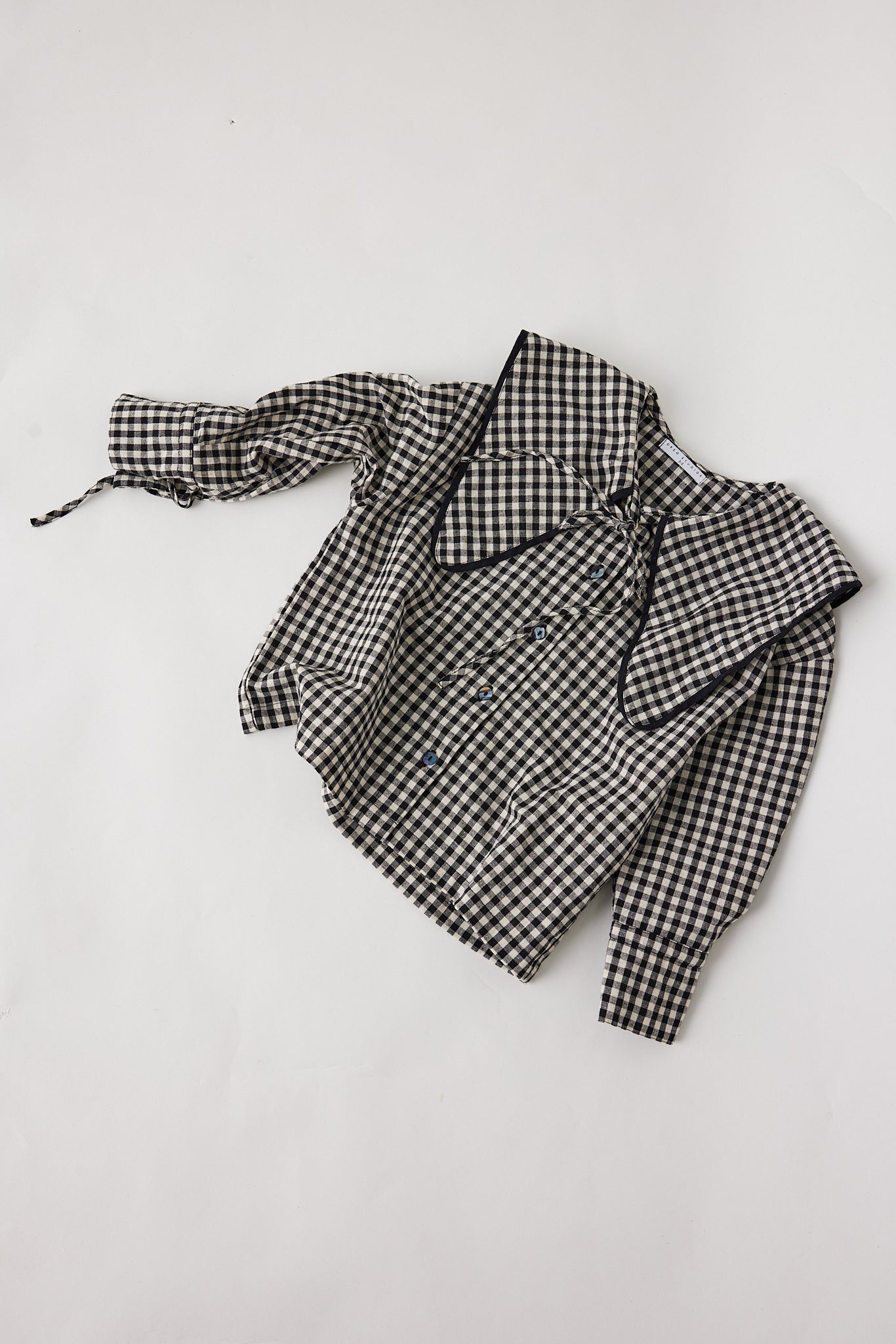 The Asake blouse is an oversized shape featuring a large collar, functional button front with top tie and long sleeve with sleeve tie detail.
