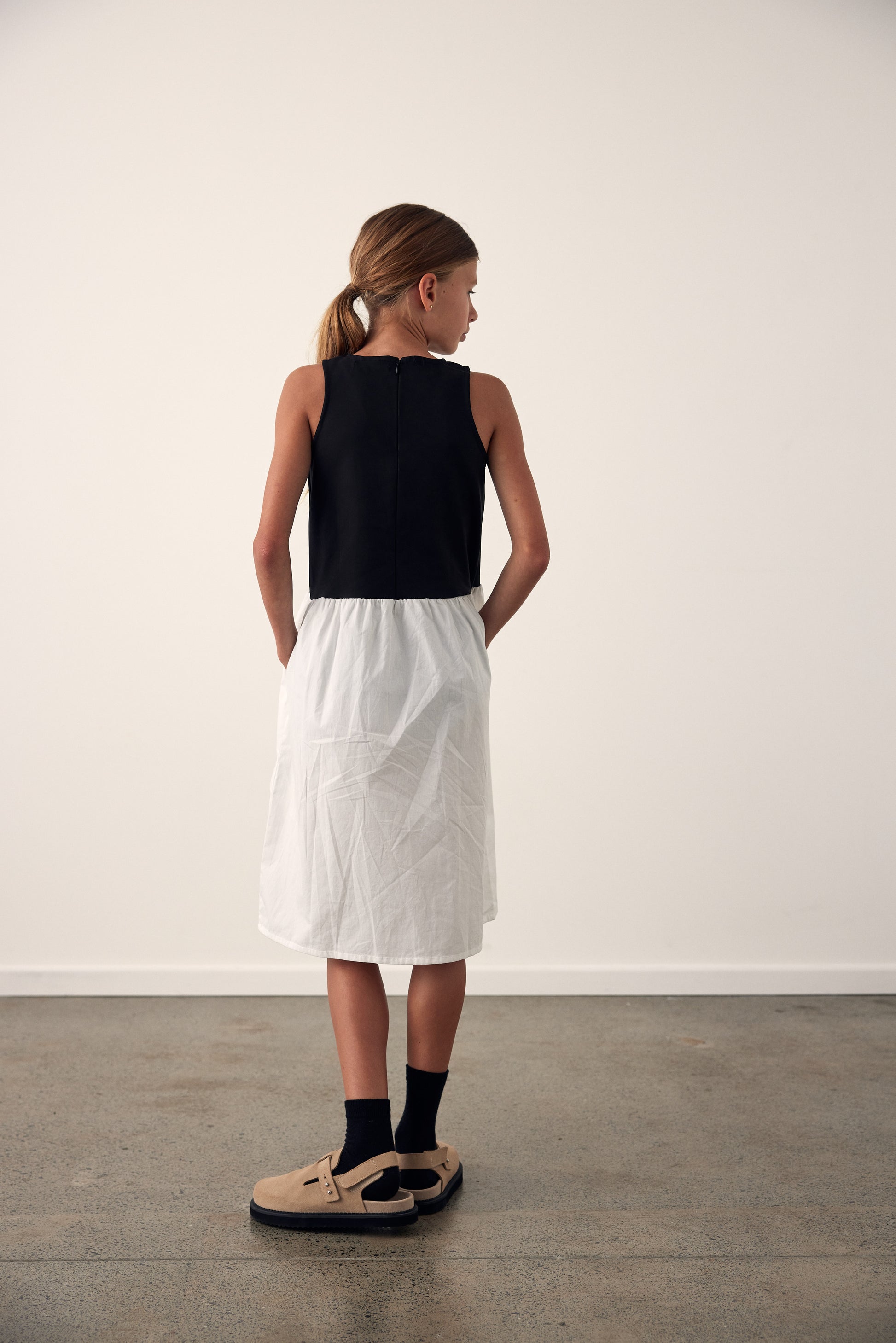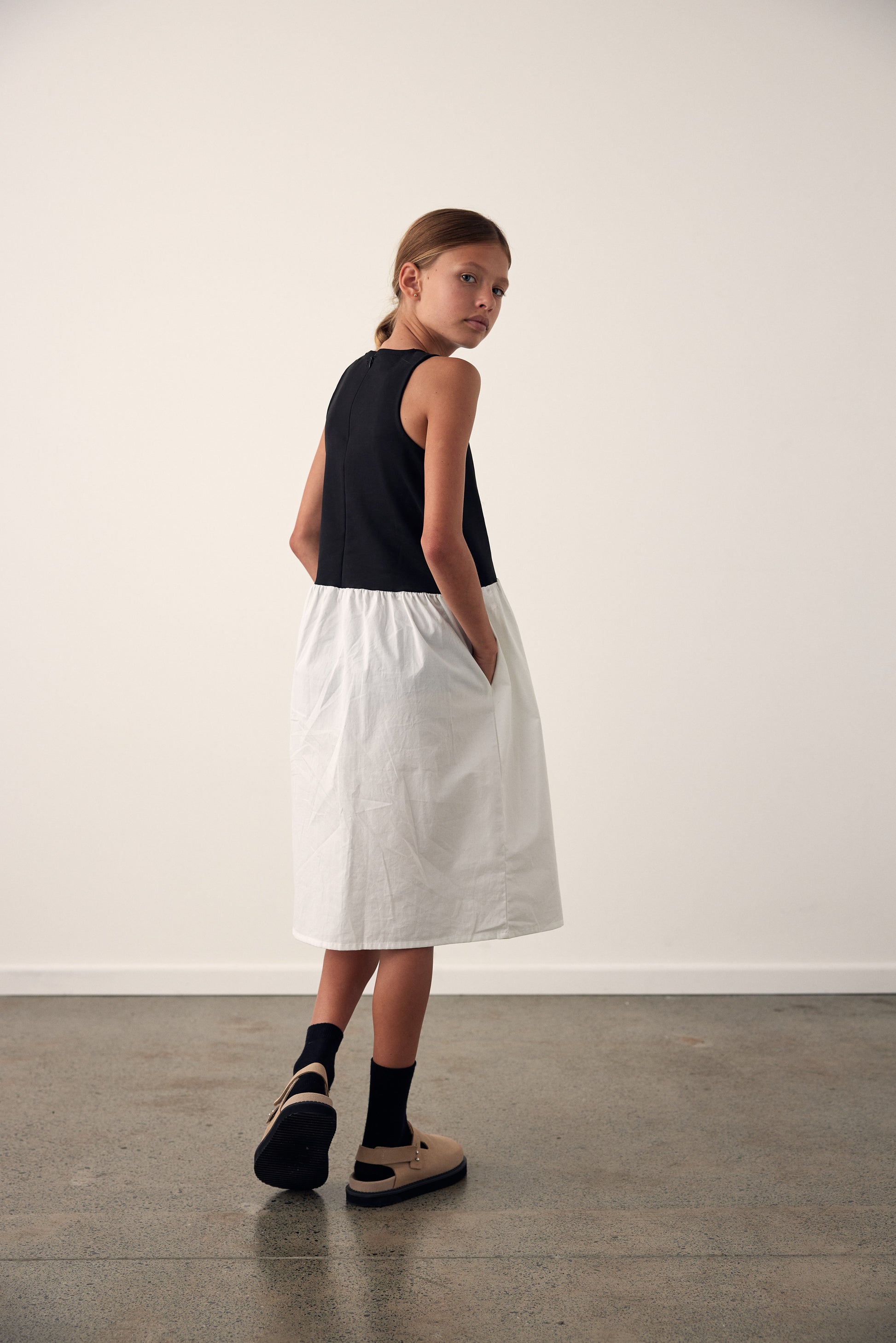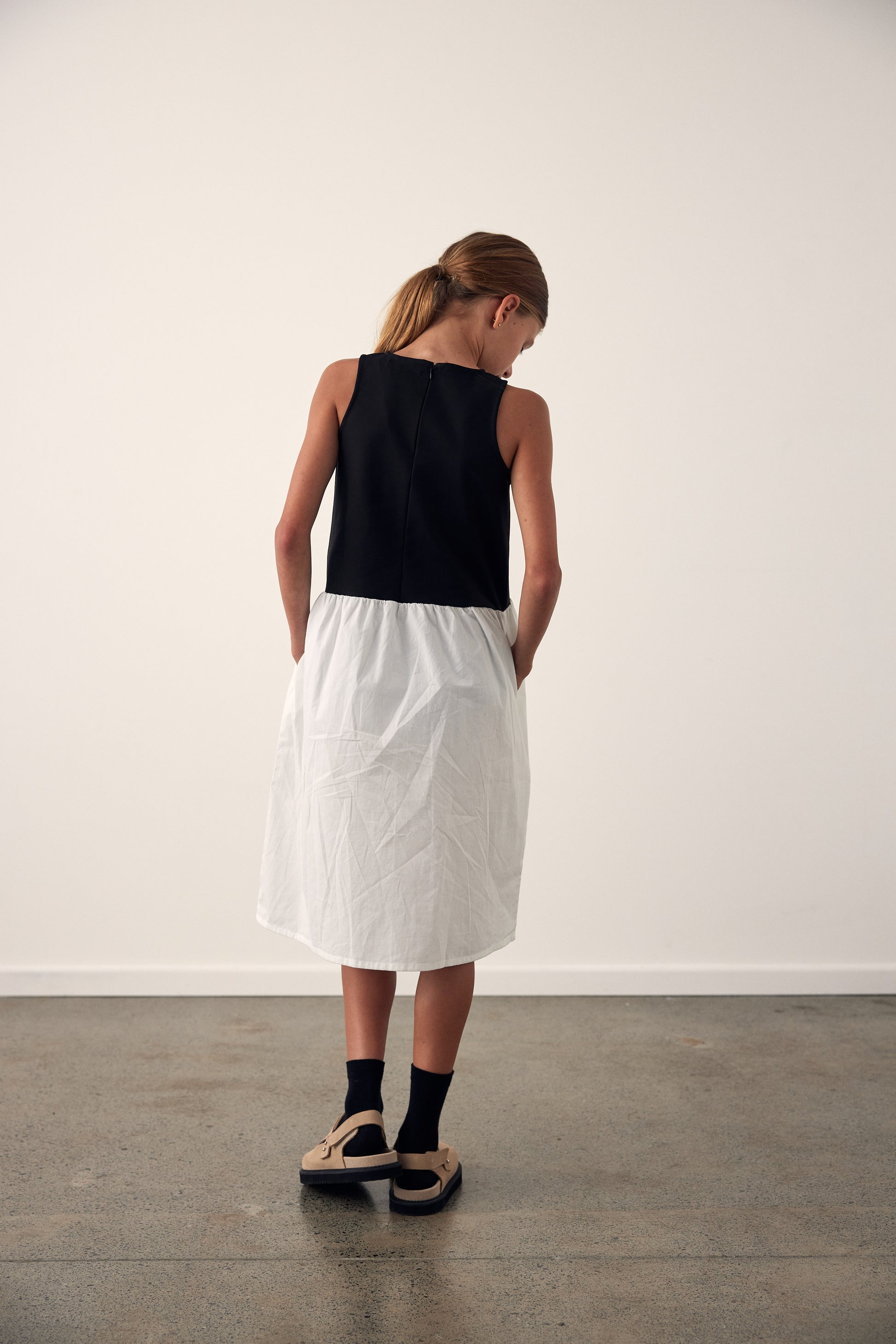 The Bettina dress has a relaxed body shape with a contrast top and skirt. The dress features a slightly dropped waist line, functional side pockets and back zipper entry.