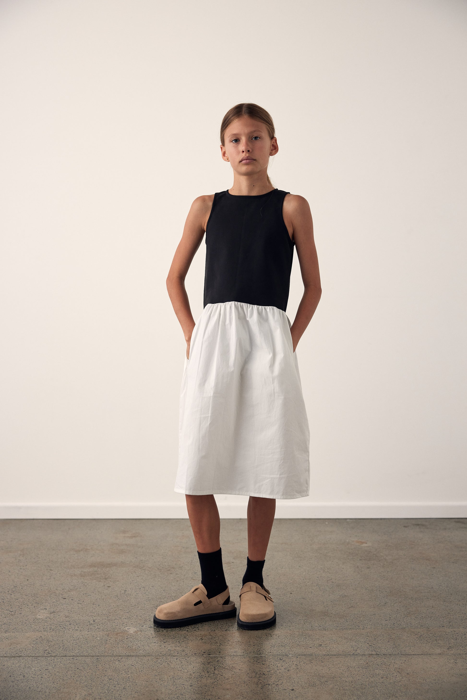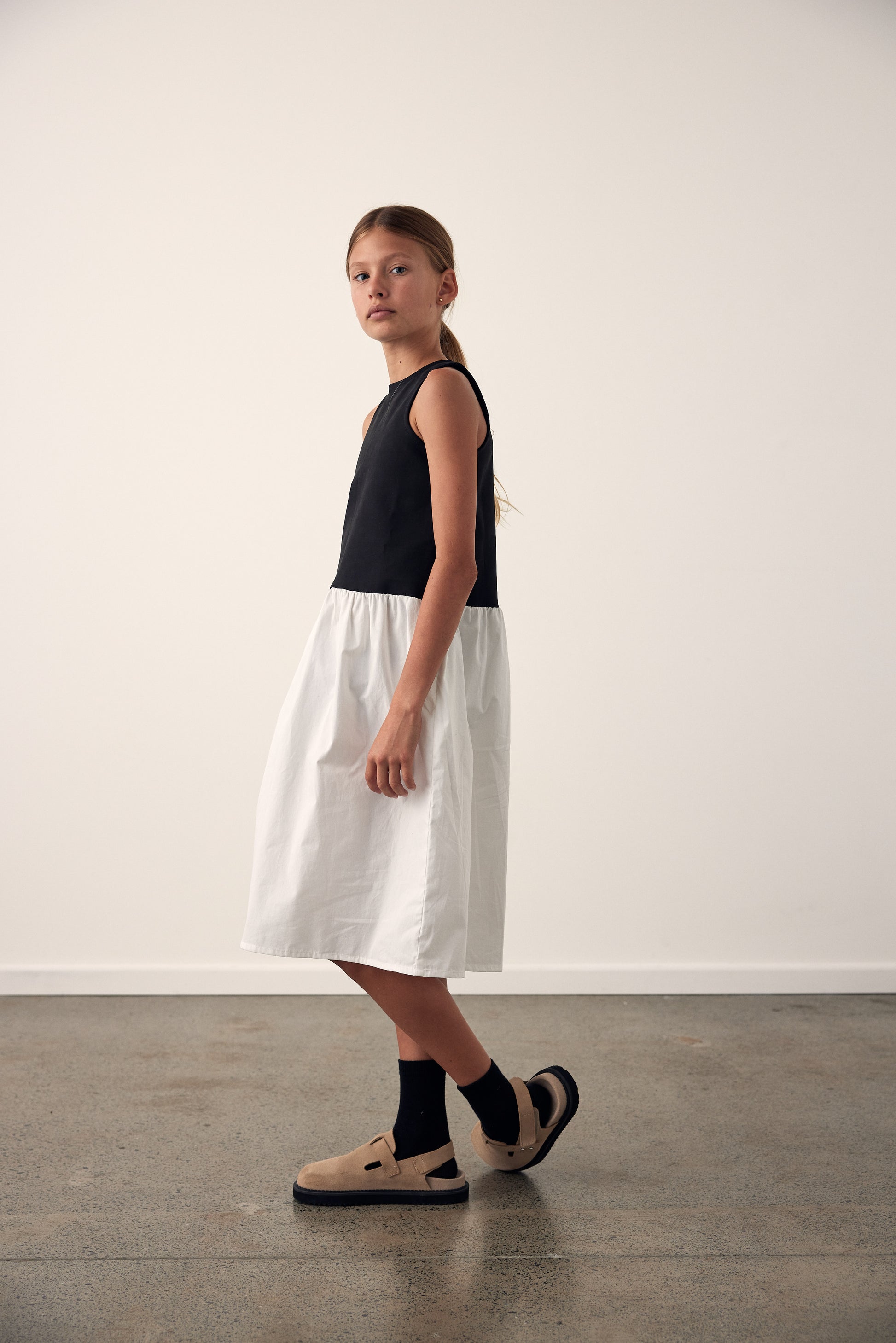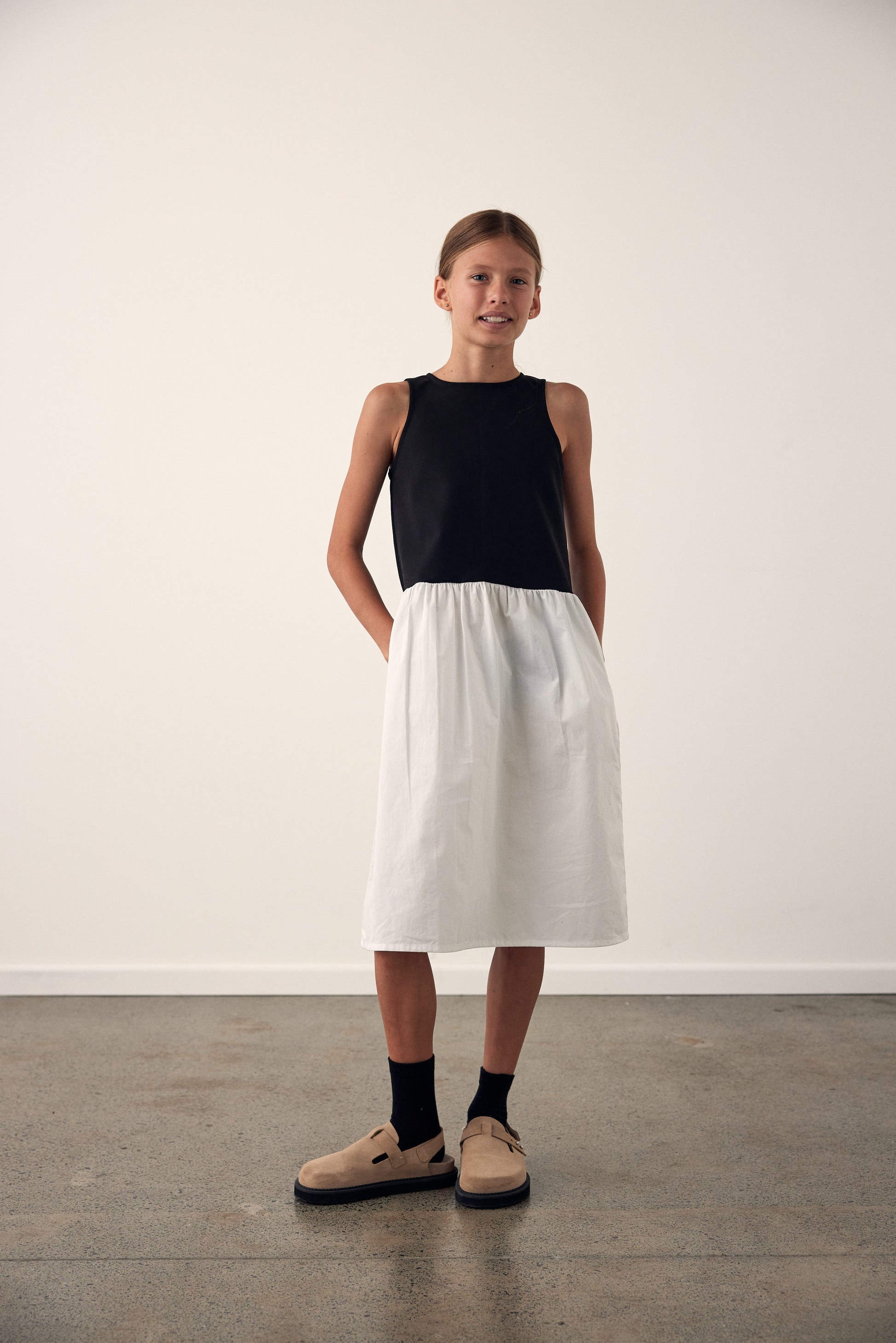 The Bettina dress has a relaxed body shape with a contrast top and skirt. The dress features a slightly dropped waist line, functional side pockets and back zipper entry.