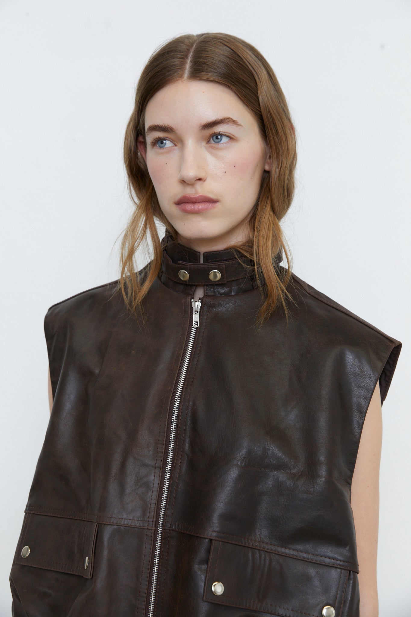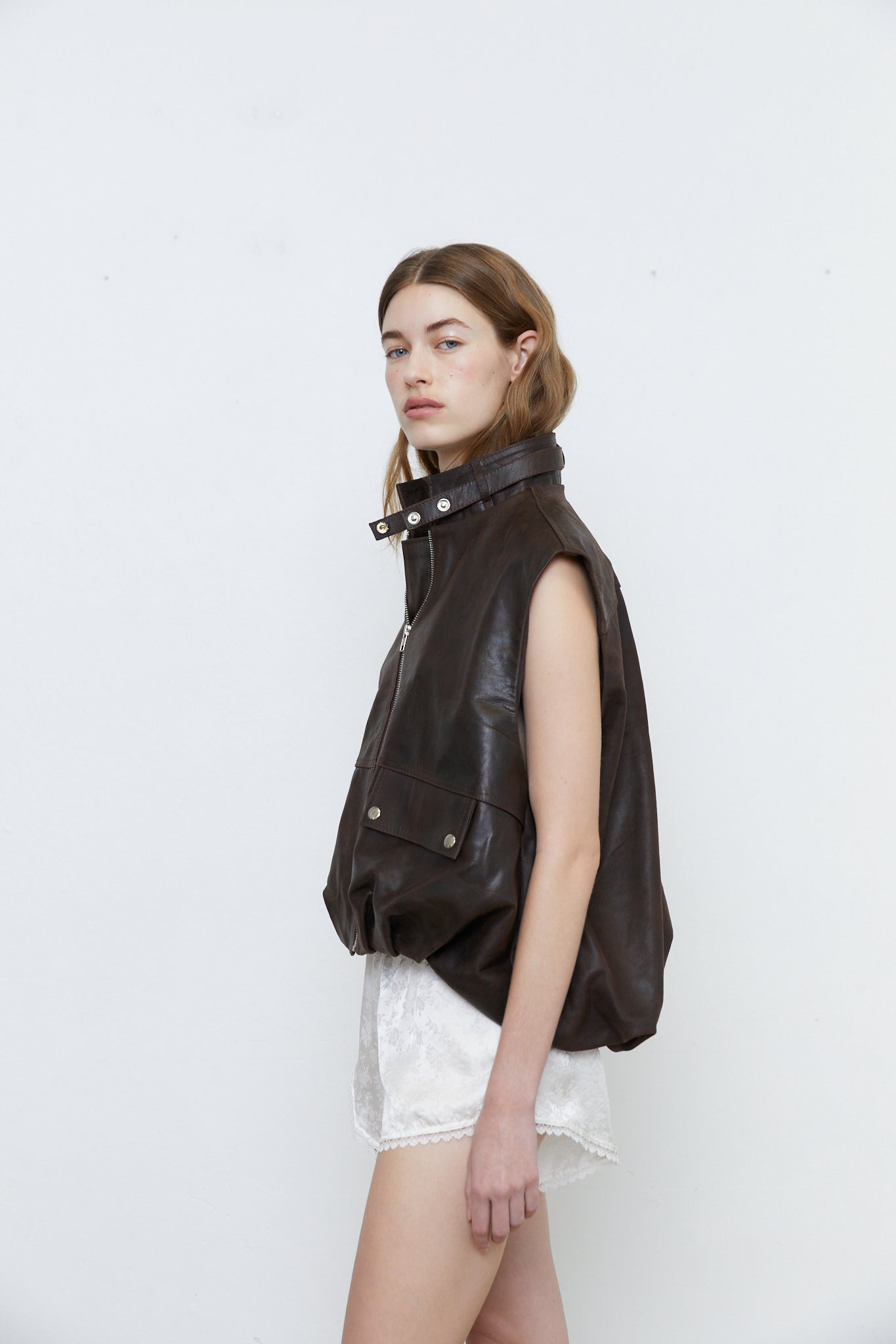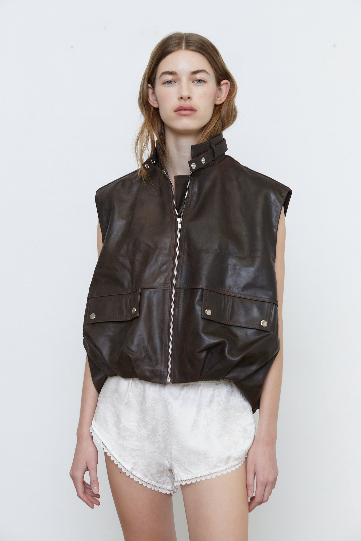 The Carmelina leather vest is a statement piece made from 100% bovine cow leather. The vest features a full body with gathered hem, functional front pockets, front zipper, high neck collar with snap detailing.