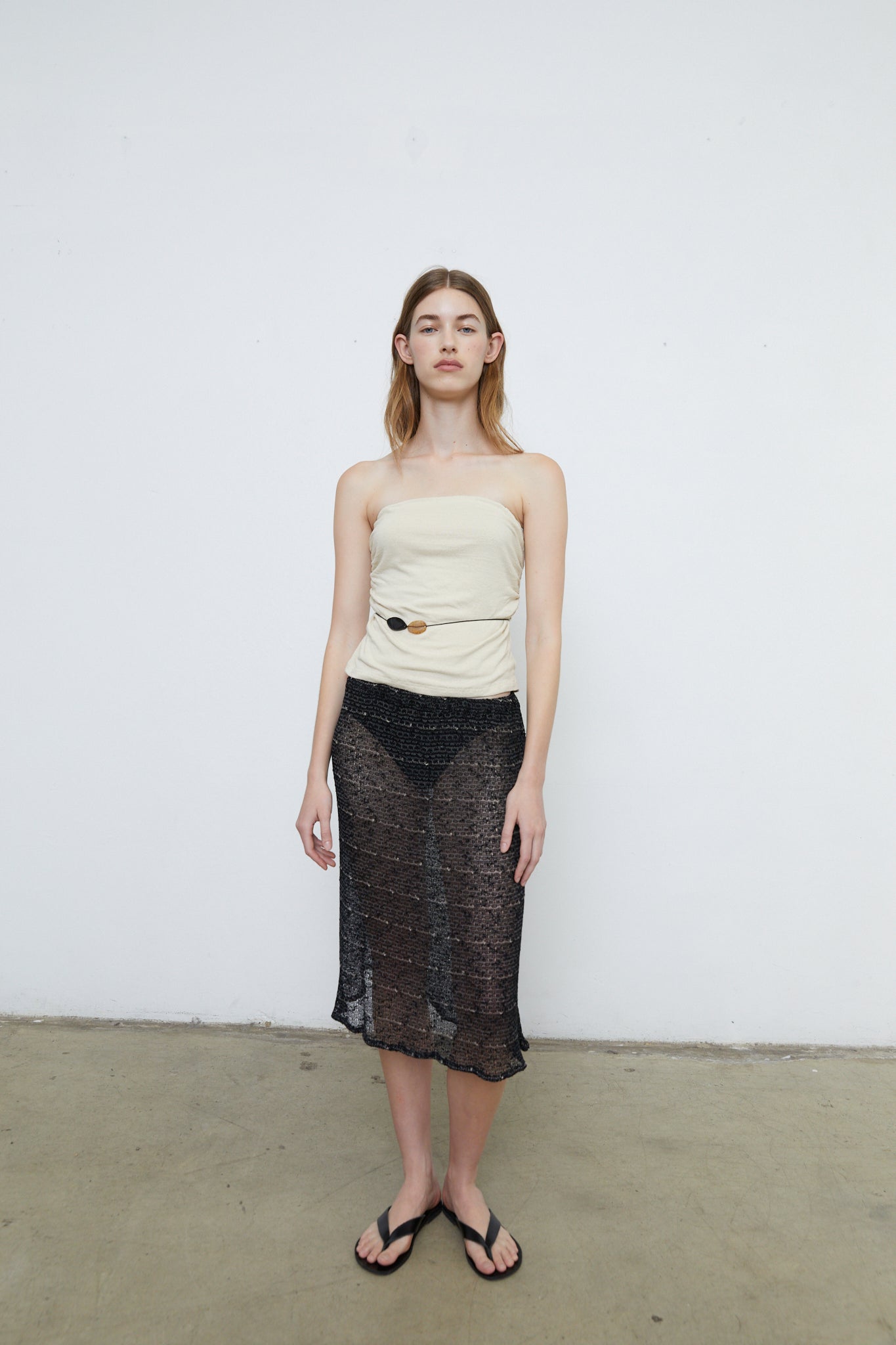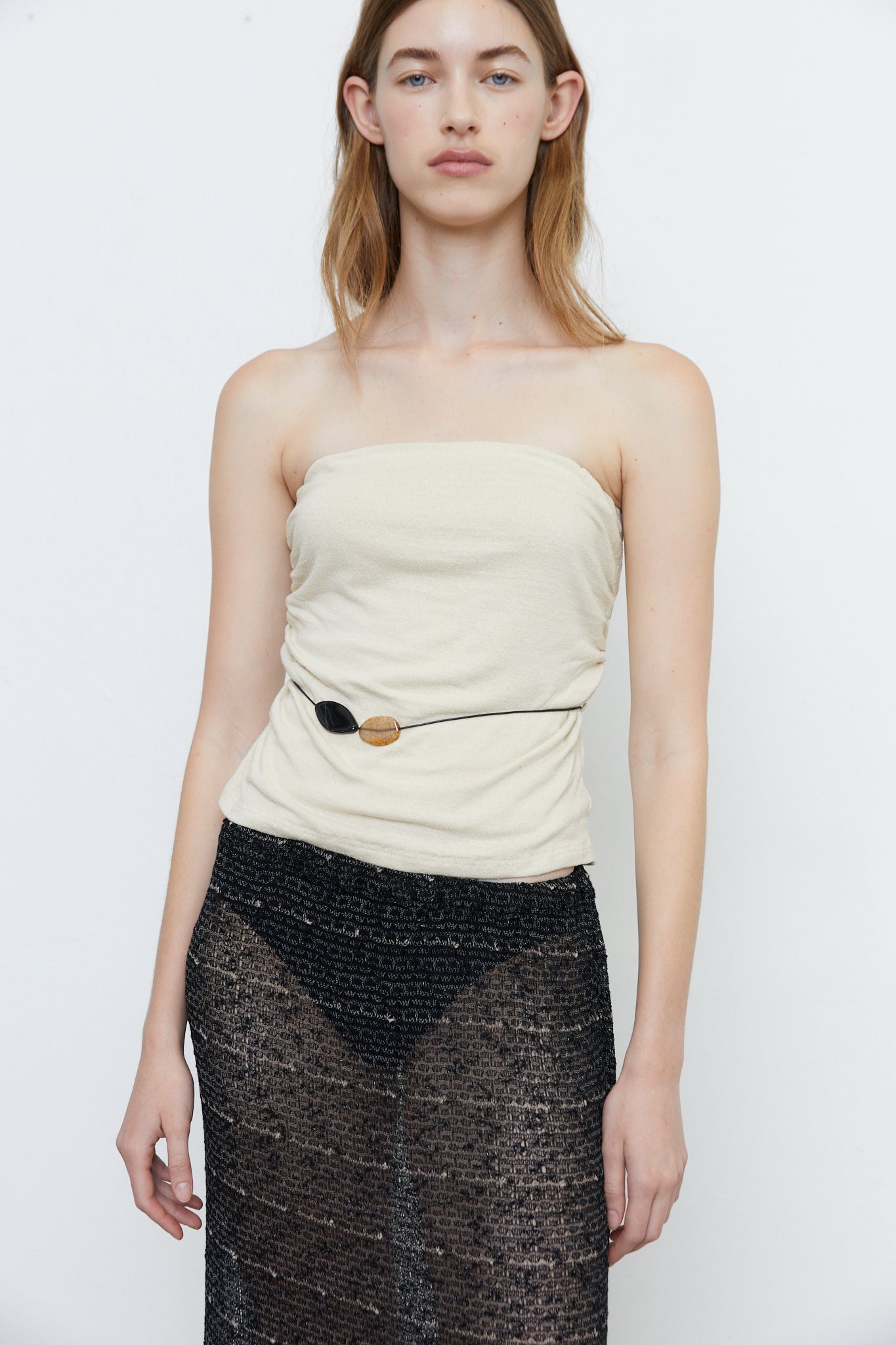 The Clementine top is a strapless top featuring a hidden top elastic and side gathering. The top comes with one leather belt strand featuring two glass beads. Belt can be worn to desire, moved around and is completely removable.