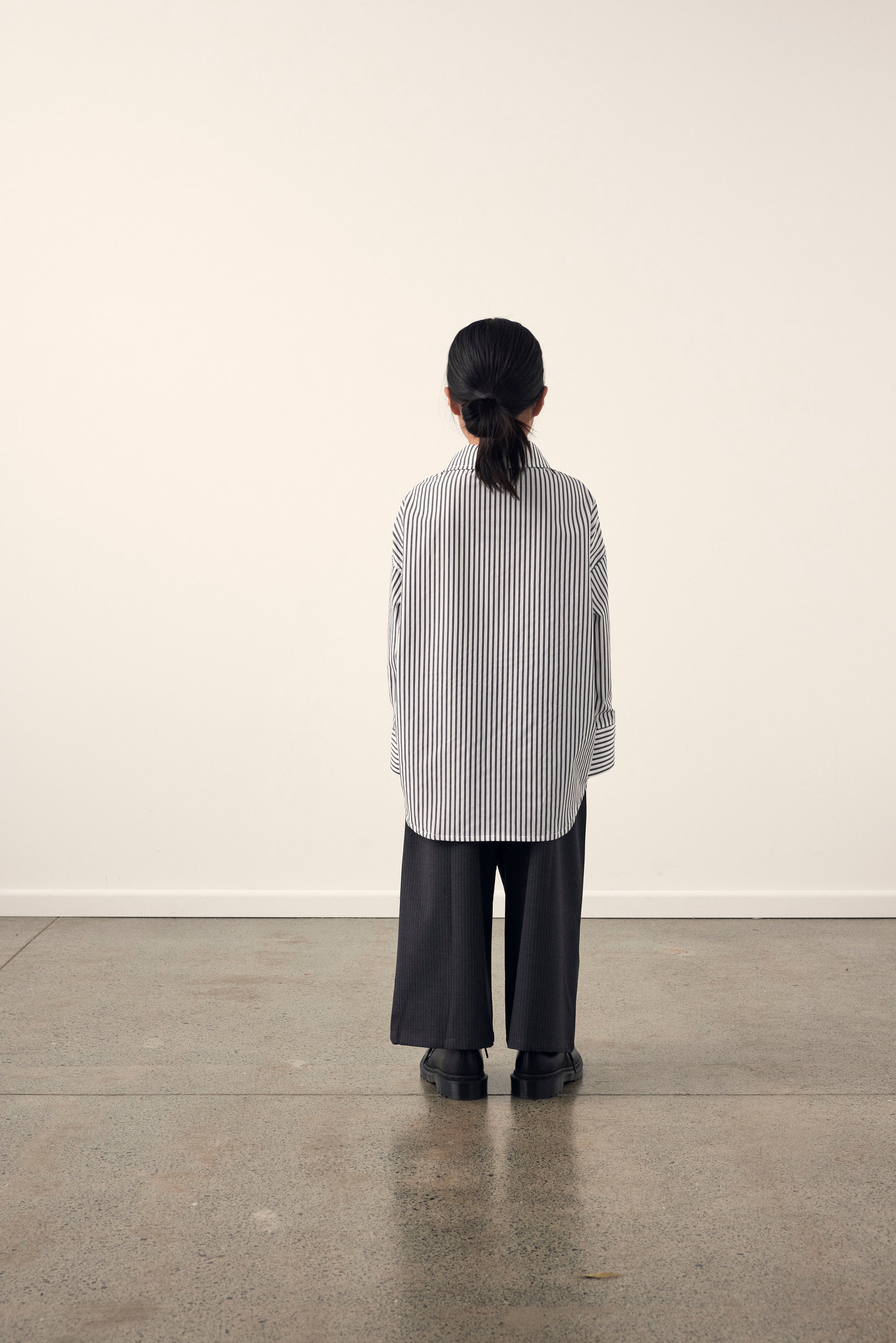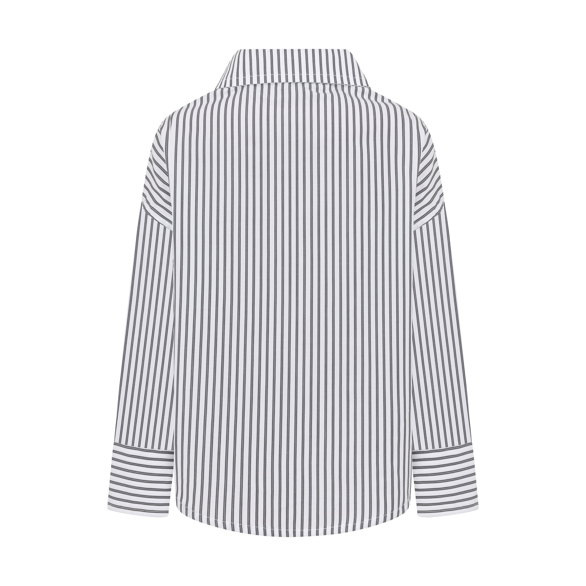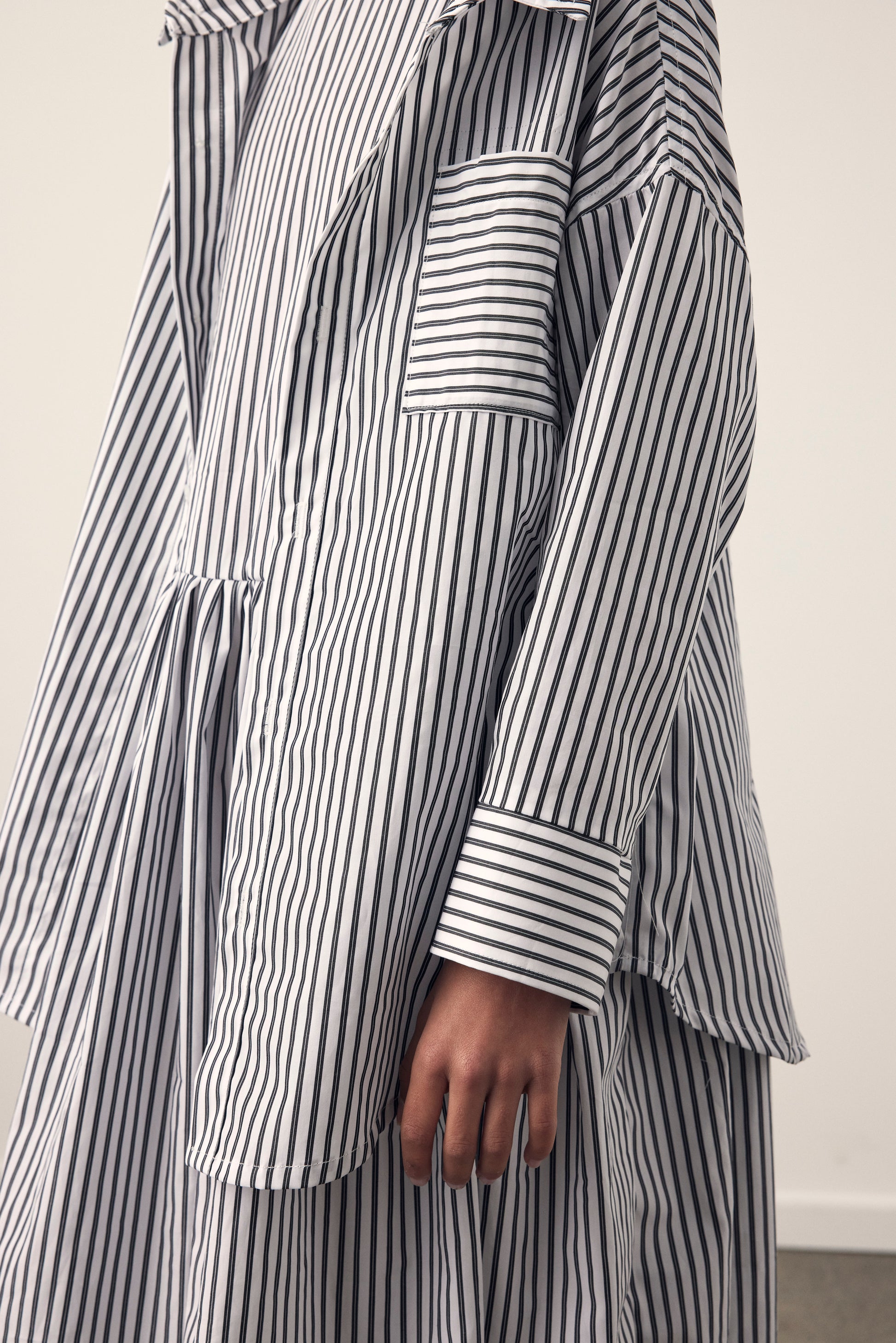 Oversized body shape - High low hemline - Button up - Relaxed sleeve and wide cuff -Front pocket - 100% cotton - Black and white stripe - Cold hand wash - Unisex style