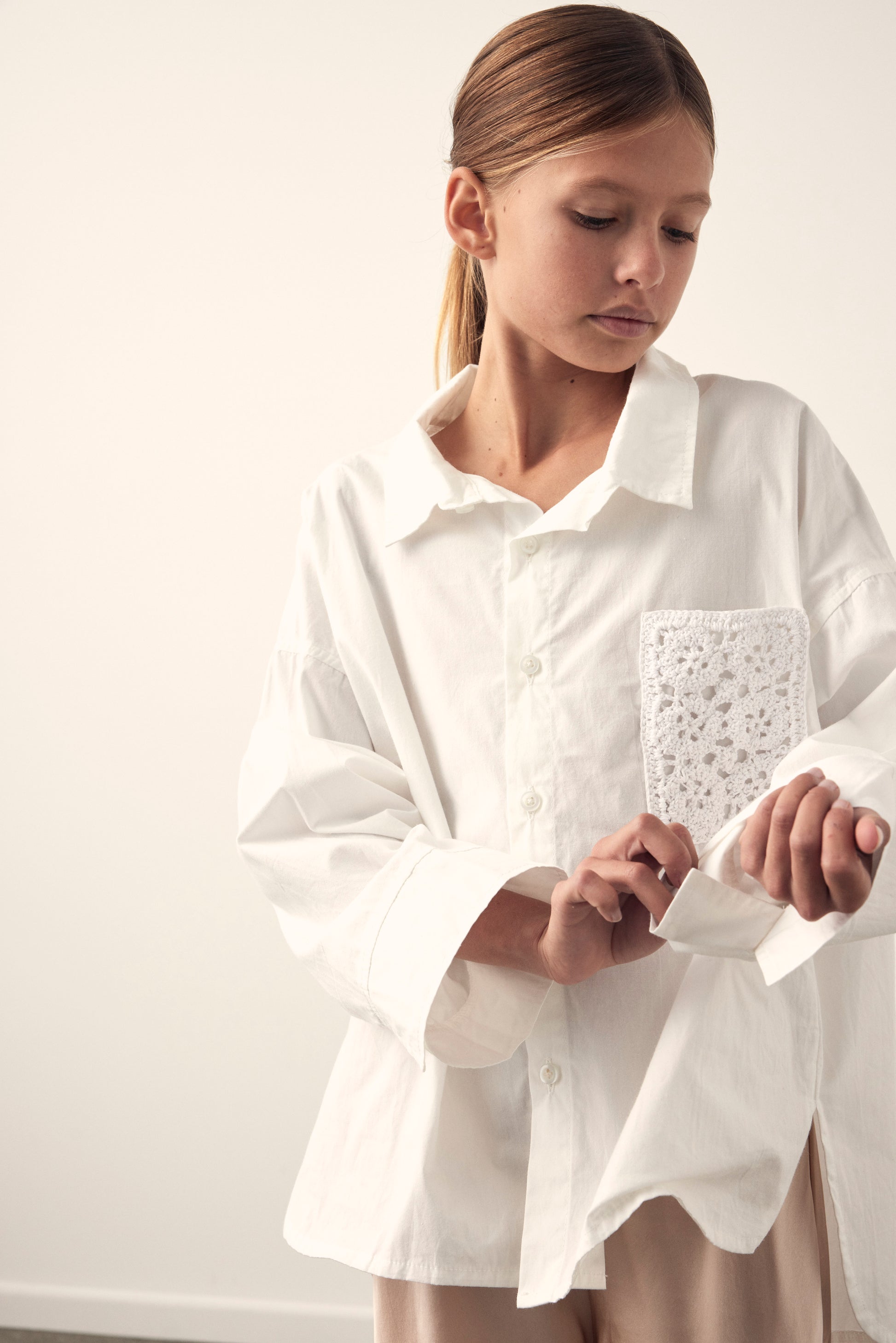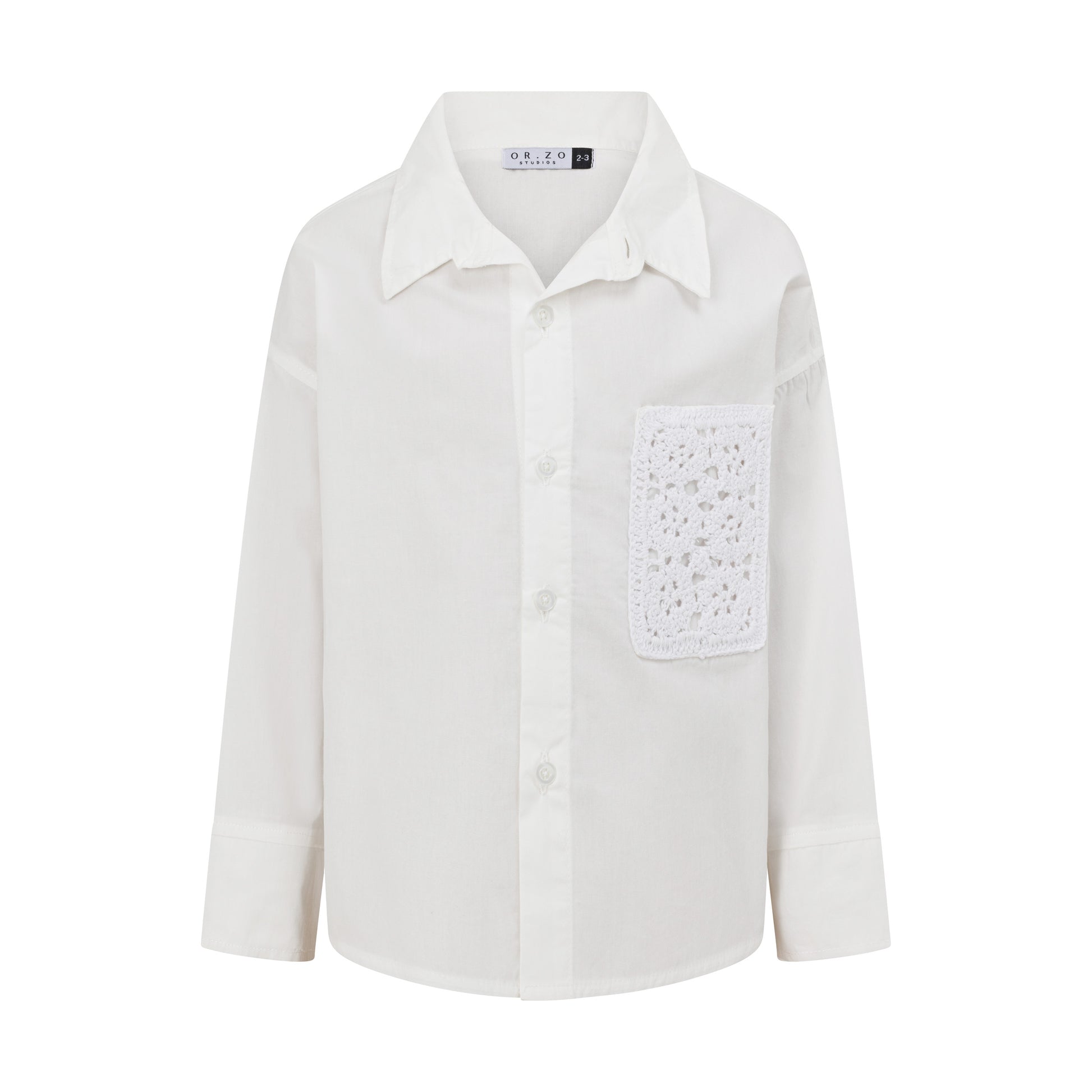 Oversized body shape - High low hemline - Button up - Relaxed sleeve - Hand crochet pocket - 100% cotton - White colour - Cold hand wash - Unisex style