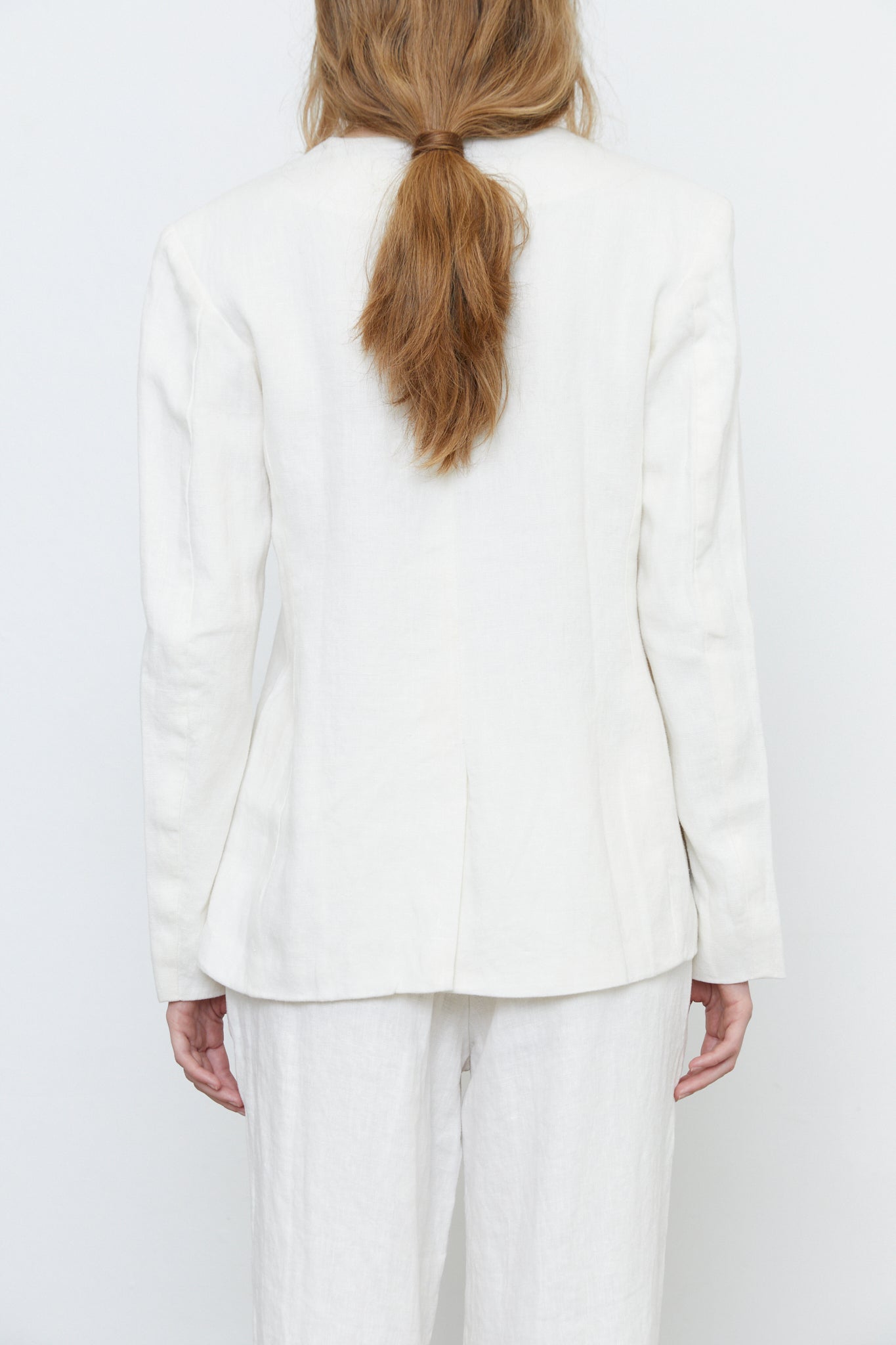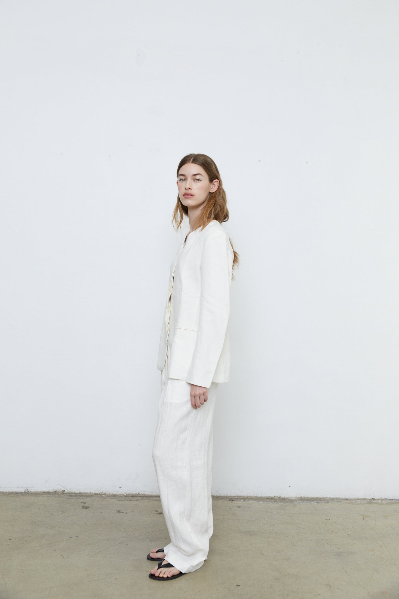 The Josephine blazer is a relax suit blazer, featuring a clean front - no collar. Front concealed buttons, full length sleeve and strong shoulder. Garment is fully lined.