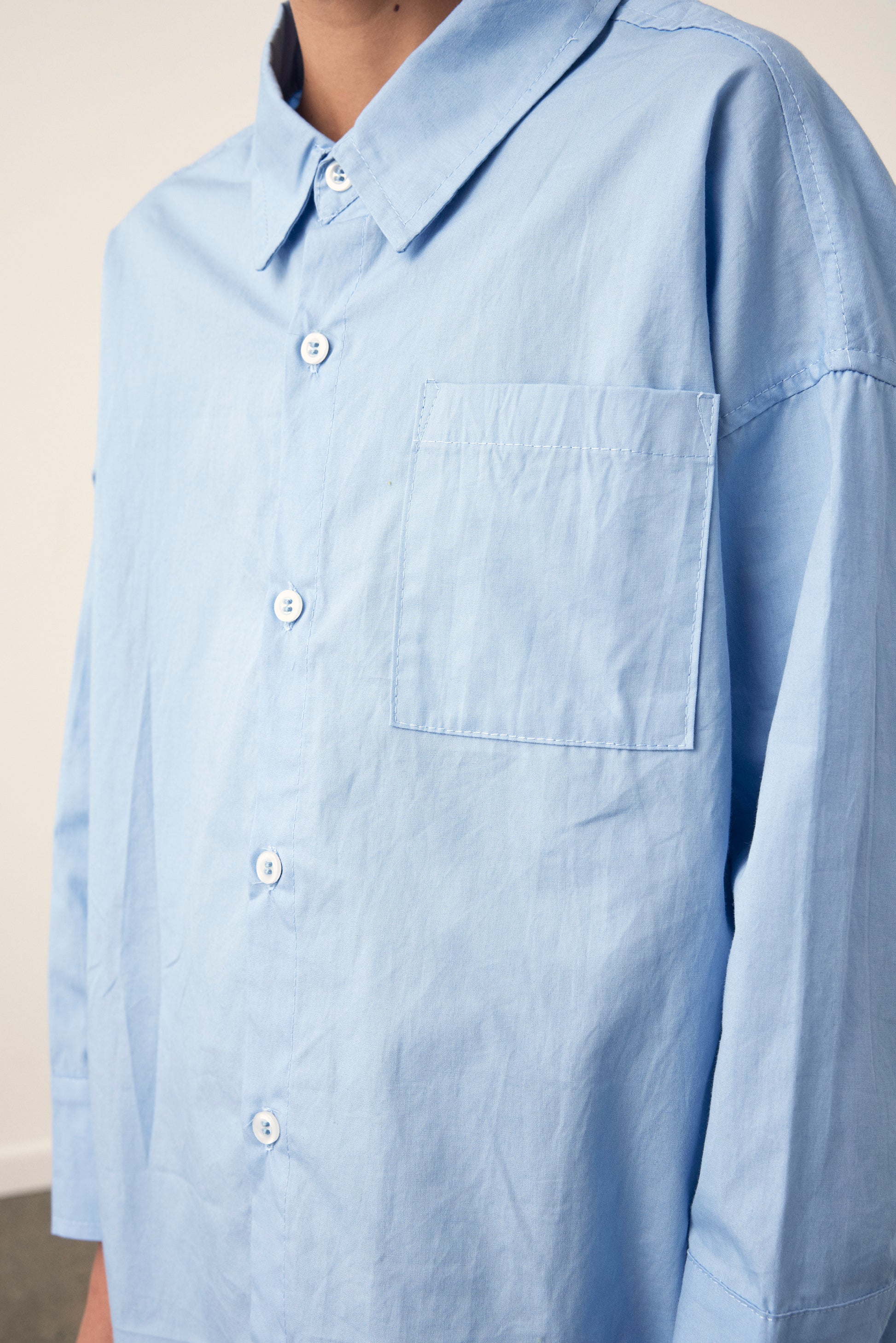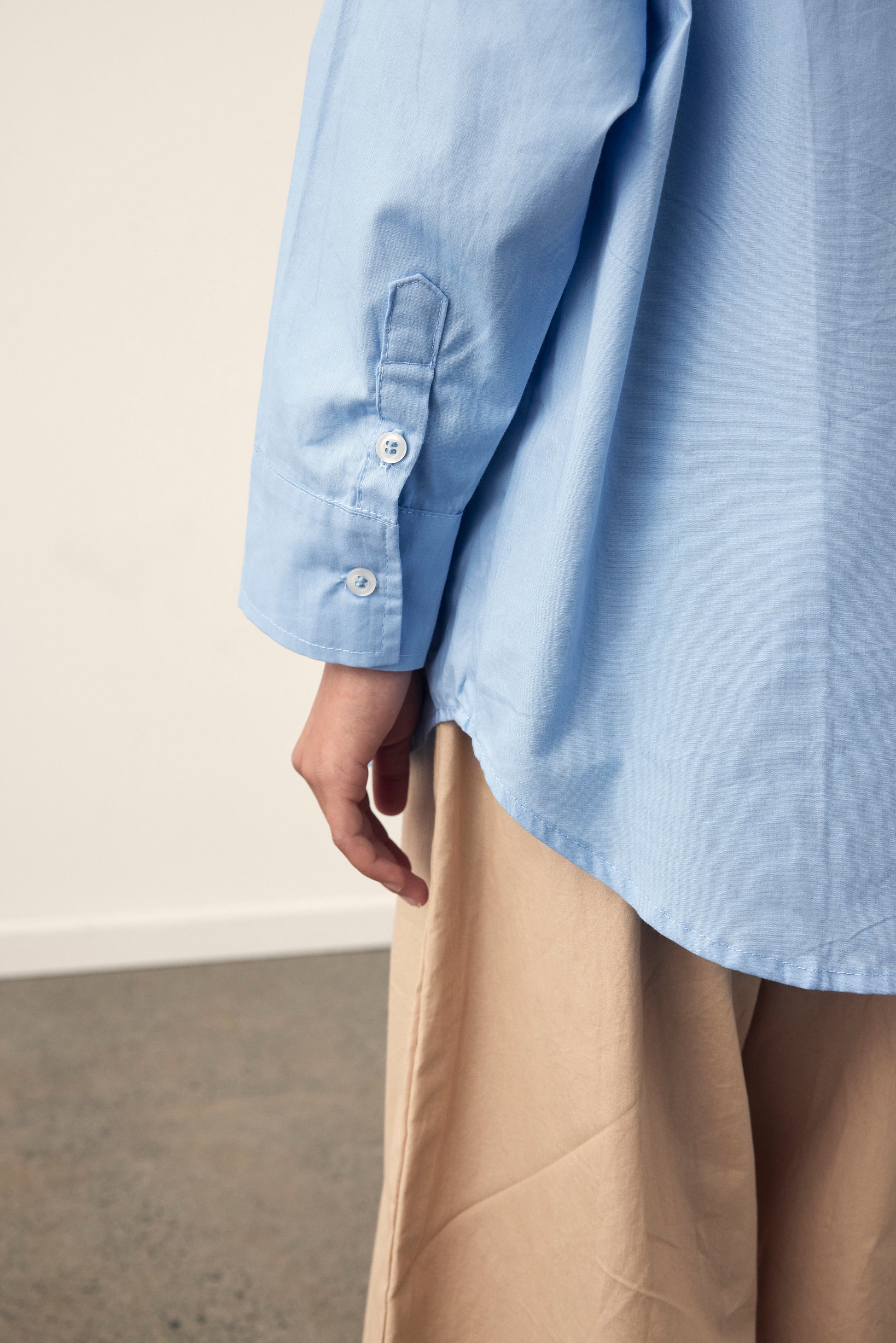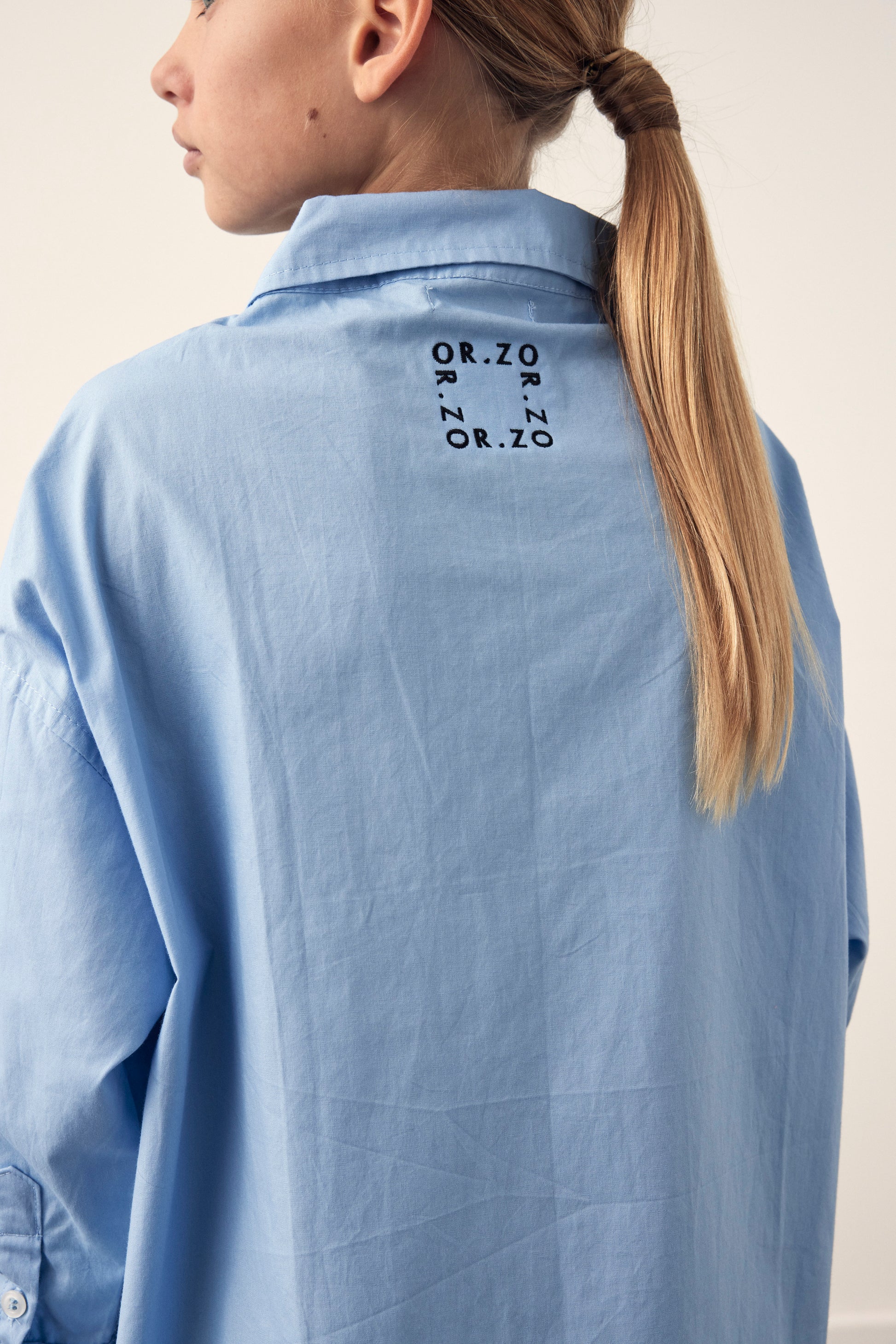 Oversized body shape - High low hemline - Shell button up - Relaxed sleeve - Back neck embroidery - 100% cotton - Sky blue colour - Cold hand wash - Unisex style
