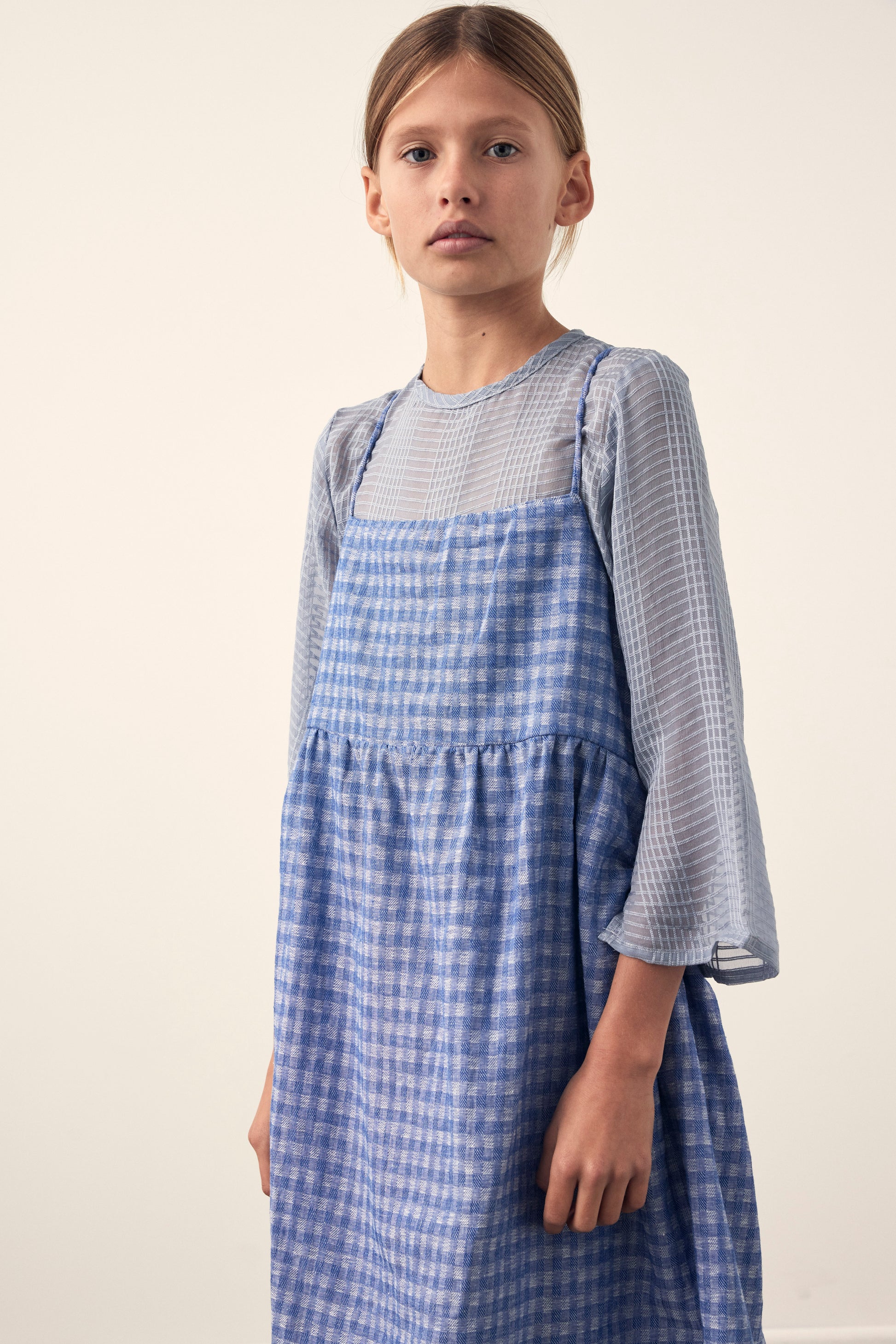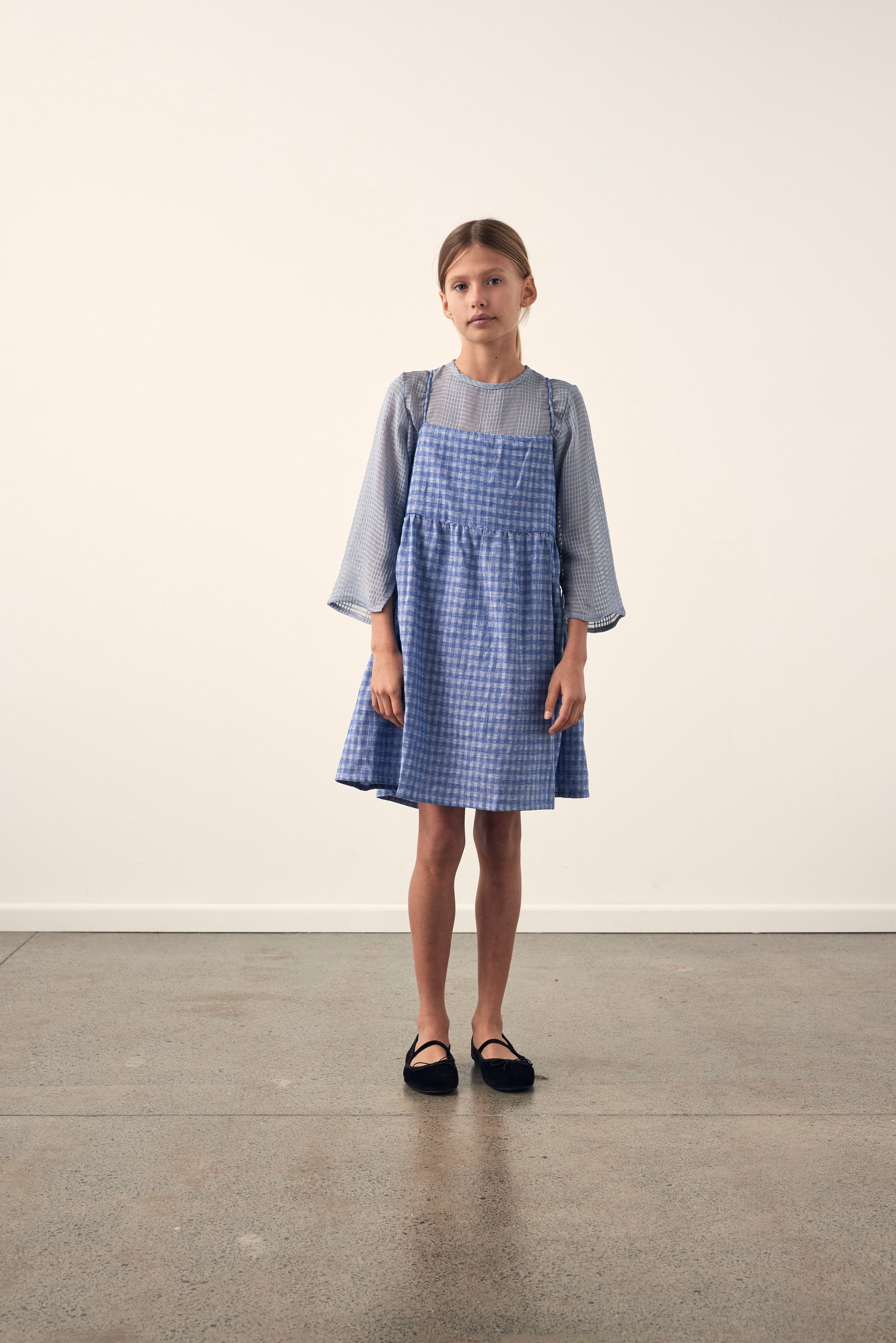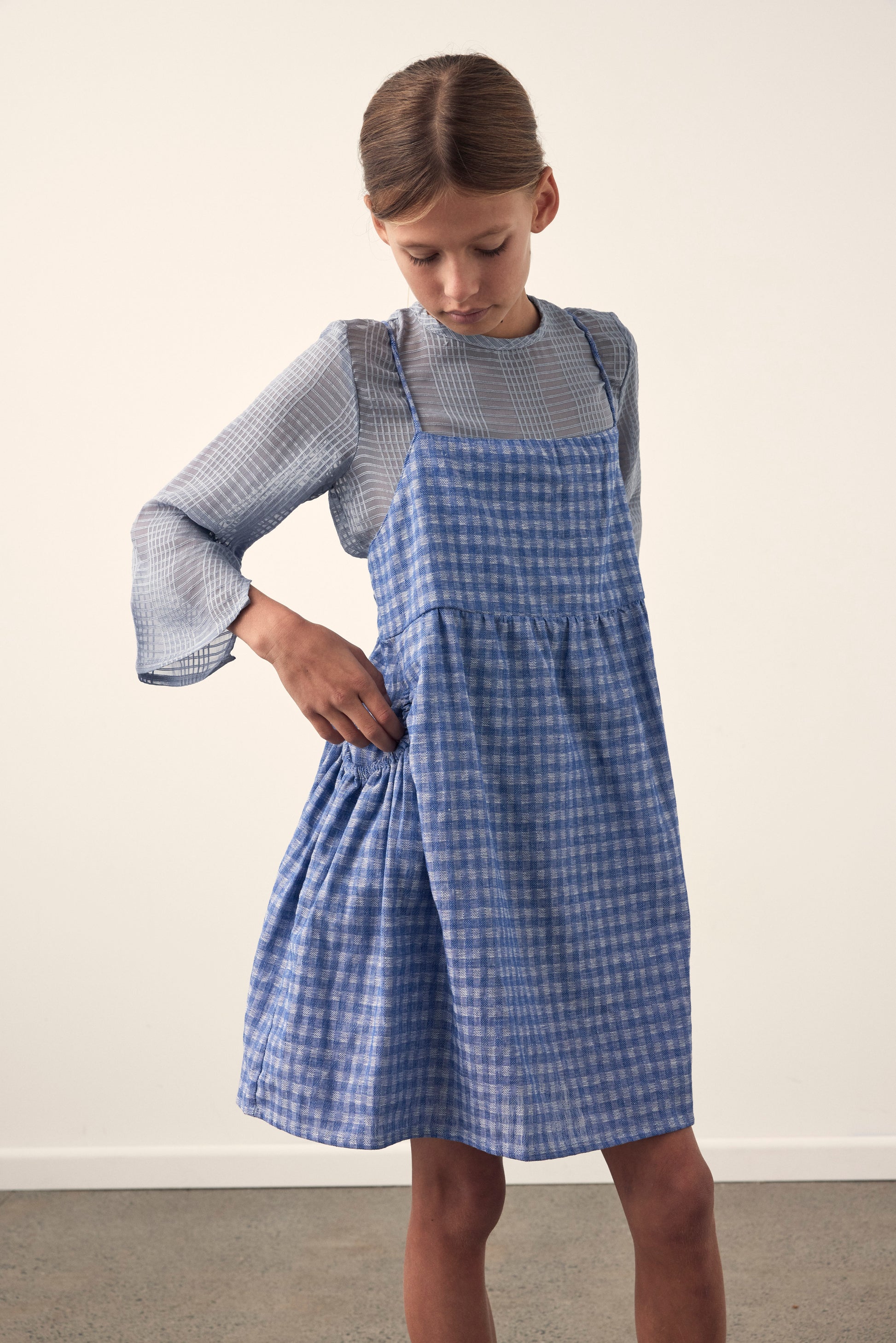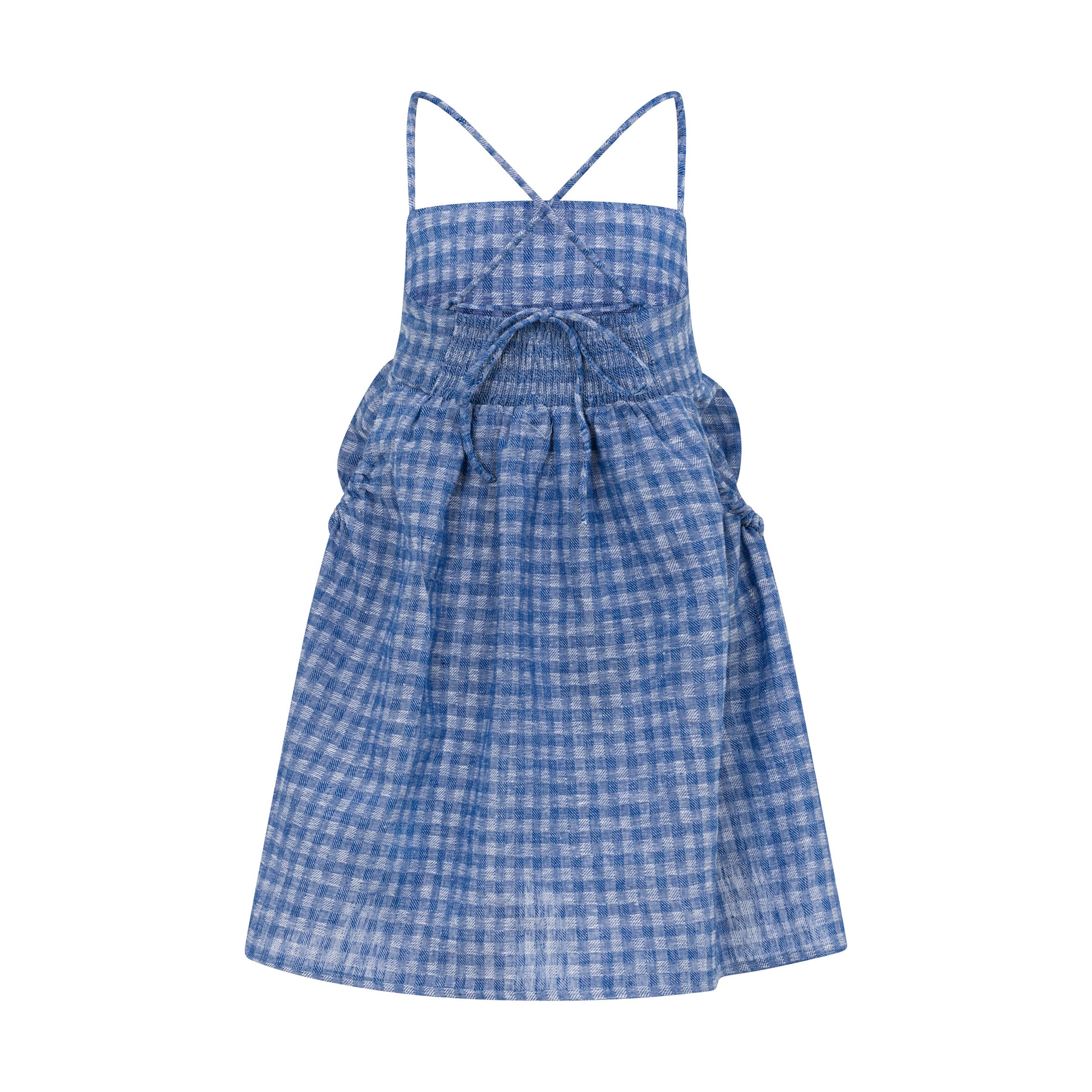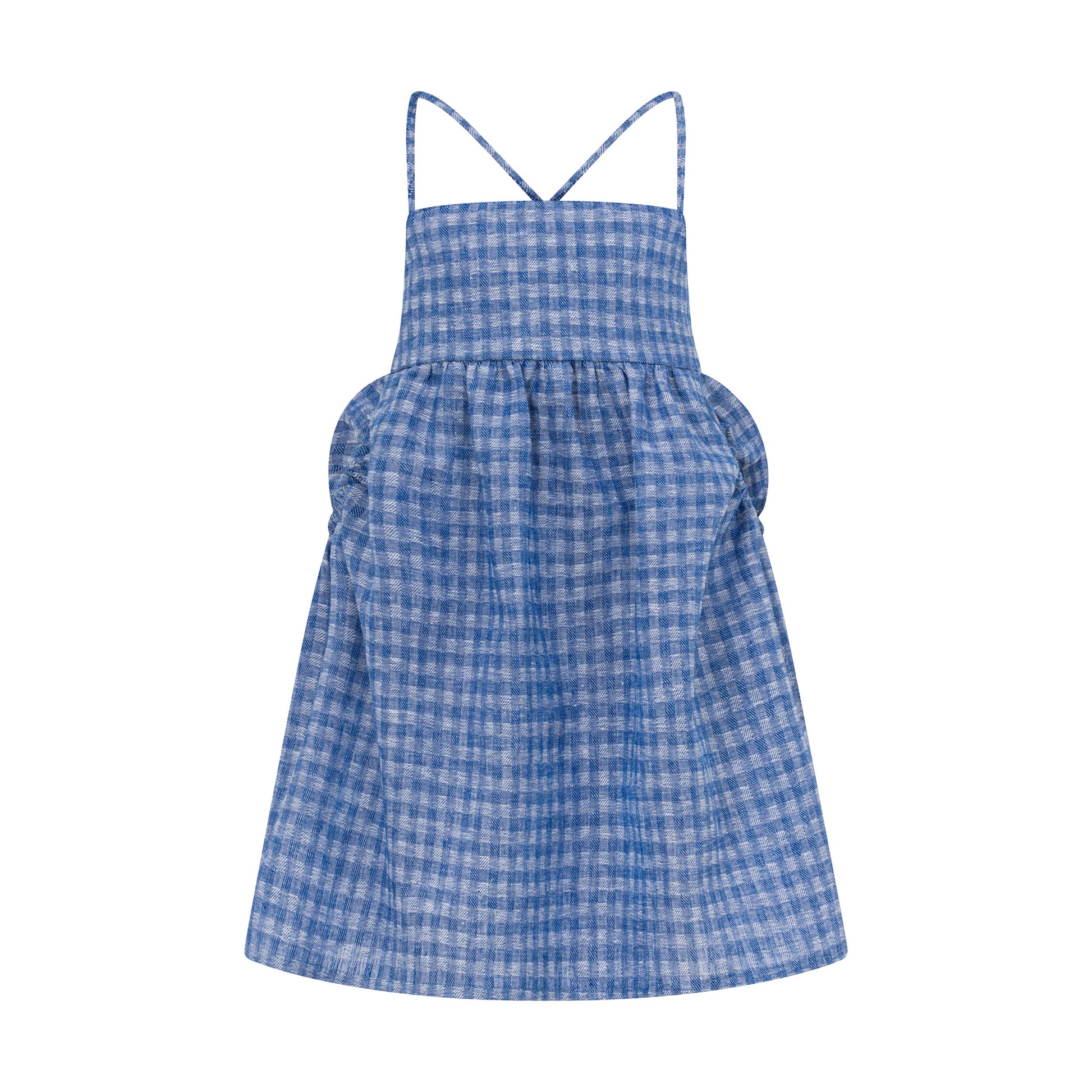 Straight front neckline - Oversized body shape - Oversized pockets - Adjustable tie straps - Cotton linen blend - Blue check - Cold hand wash