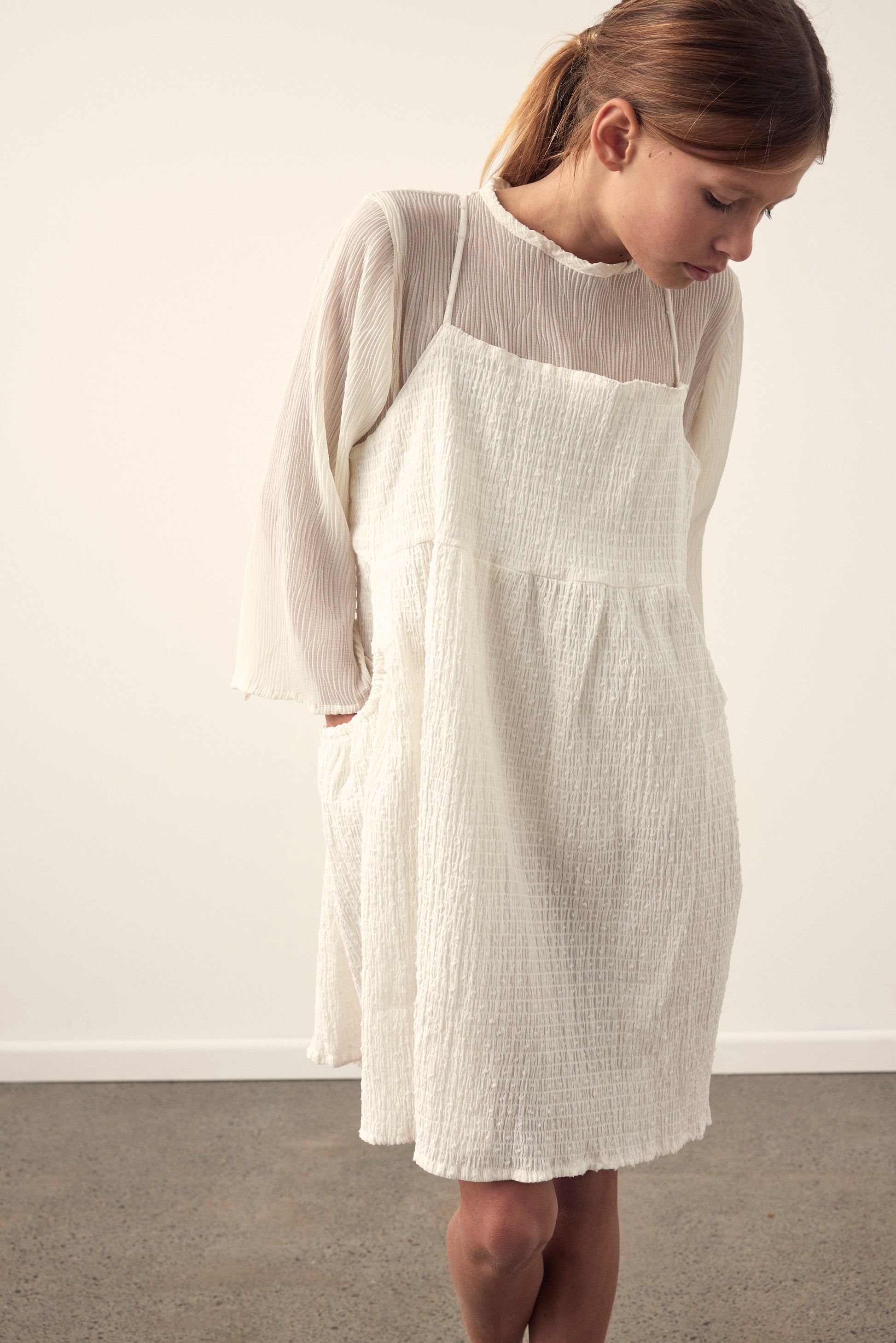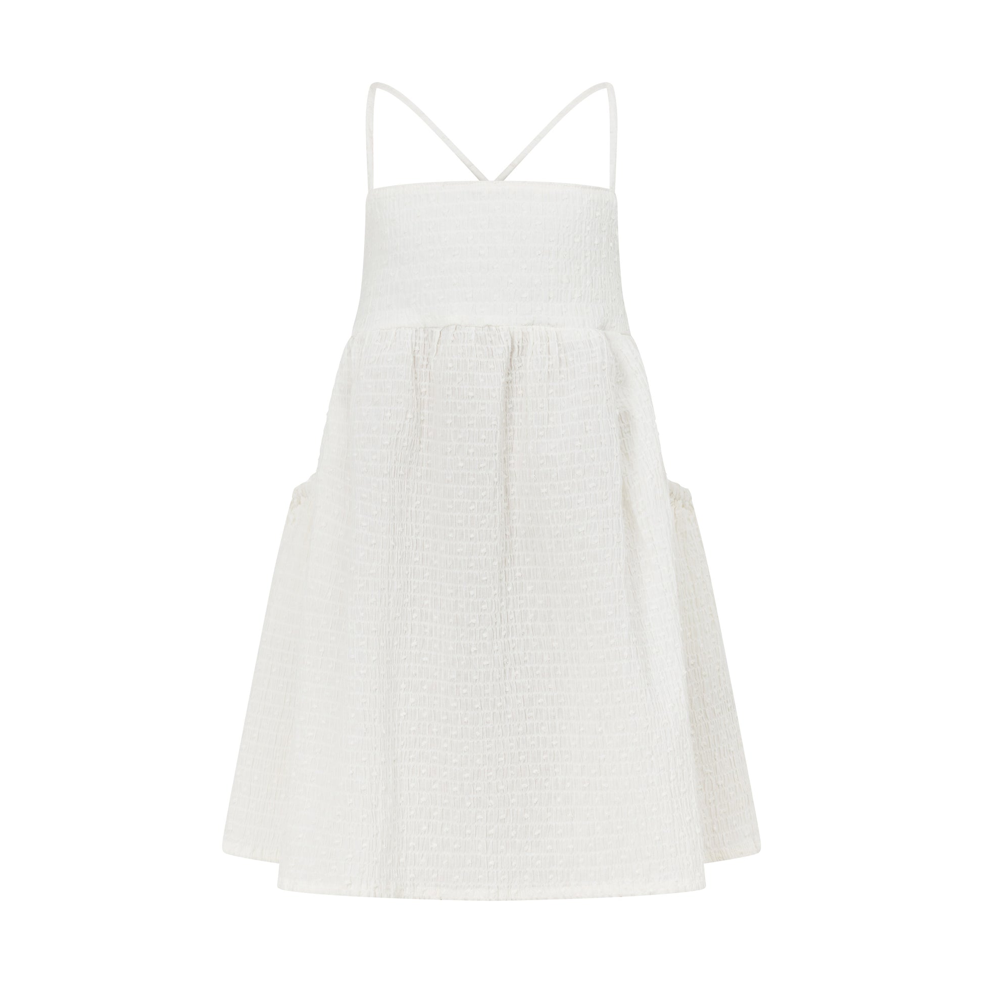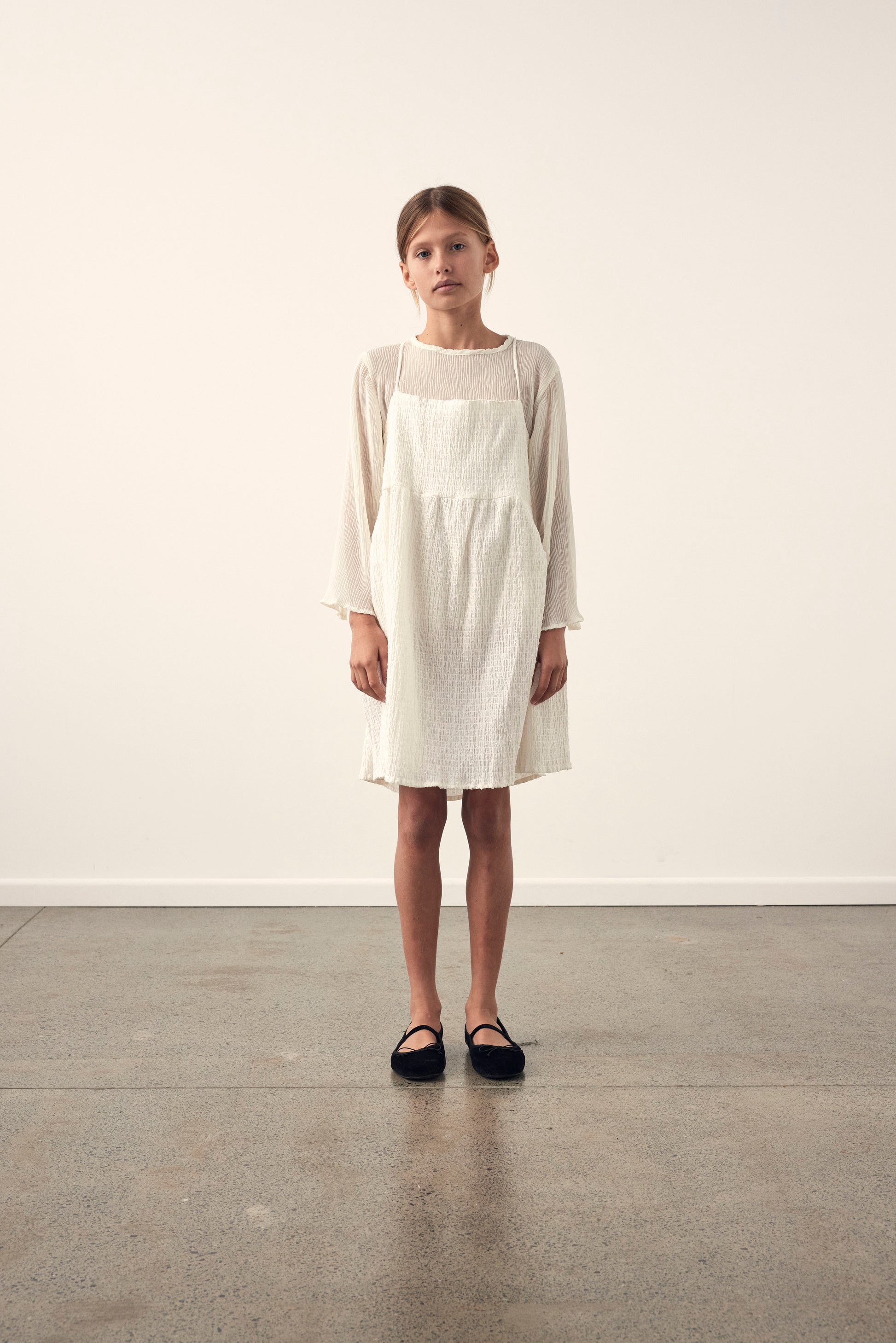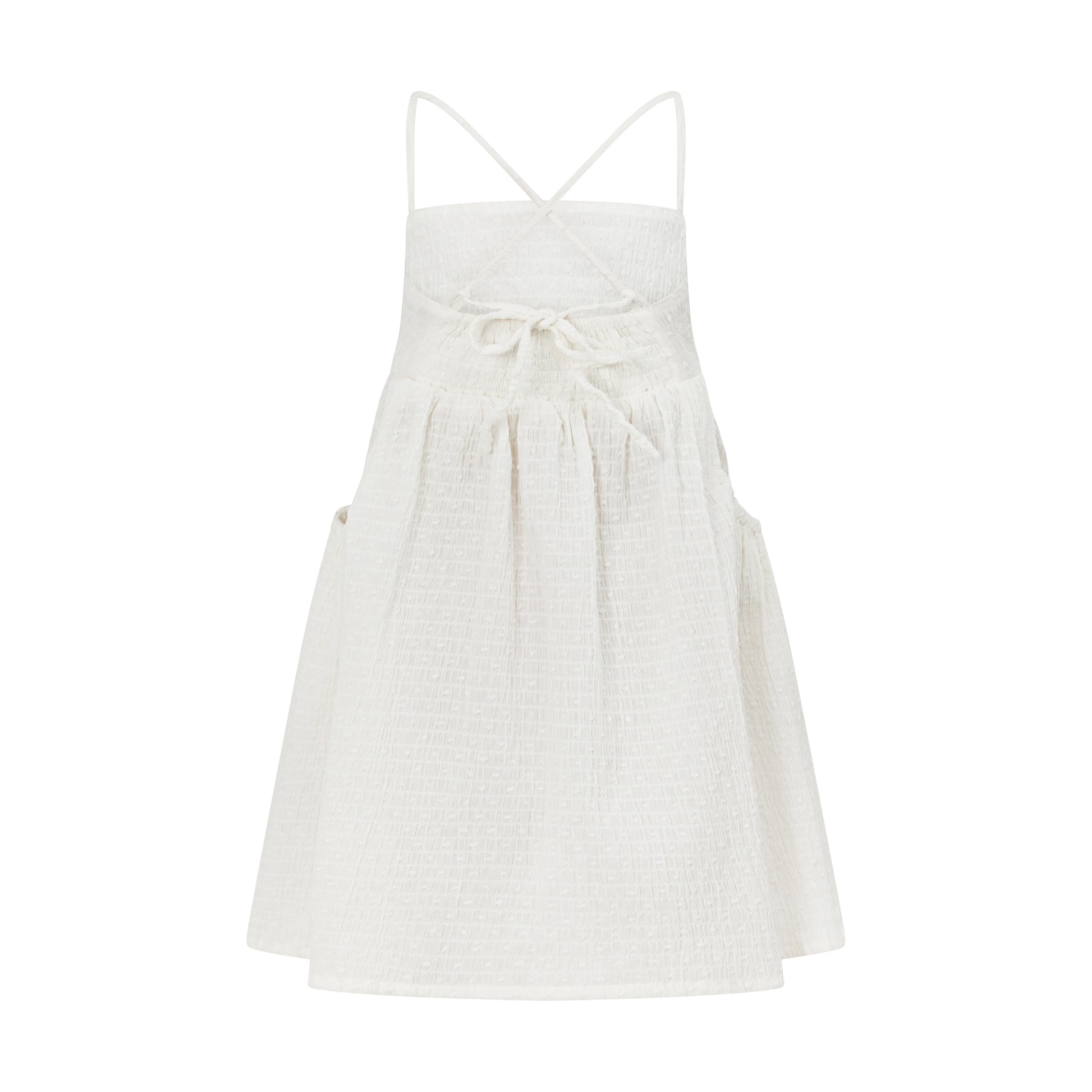 The Mem dress was designed for layering. With an oversized body shape, the dress features straight front neckline, full body, side pockets and adjustable tie straps.