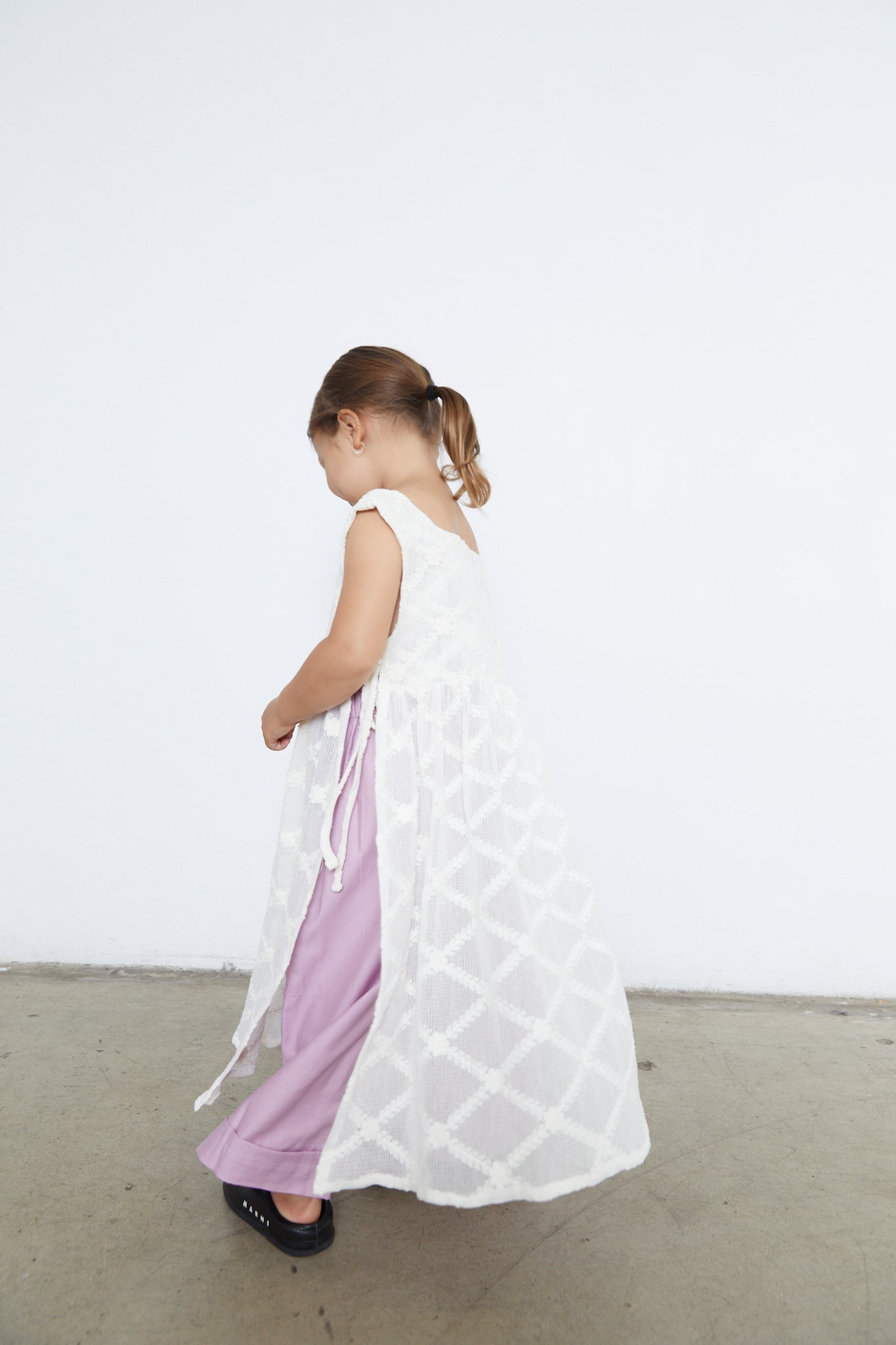 The Rio apron is the perfect layering piece. Featuring a square neckline, thick straps and side ties. The apron is open on both sides of the garment.